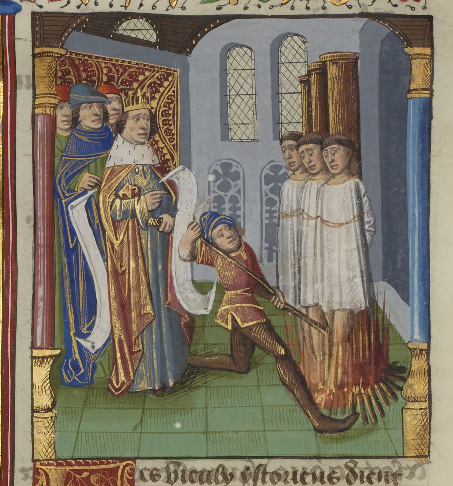 Parigi, Bibliothèque Nationale de France, Fr. 234, f. 195r. Filippo il Bello, accompagnato da tre giudici, fa ardere i cavalieri Templari sul rogo.