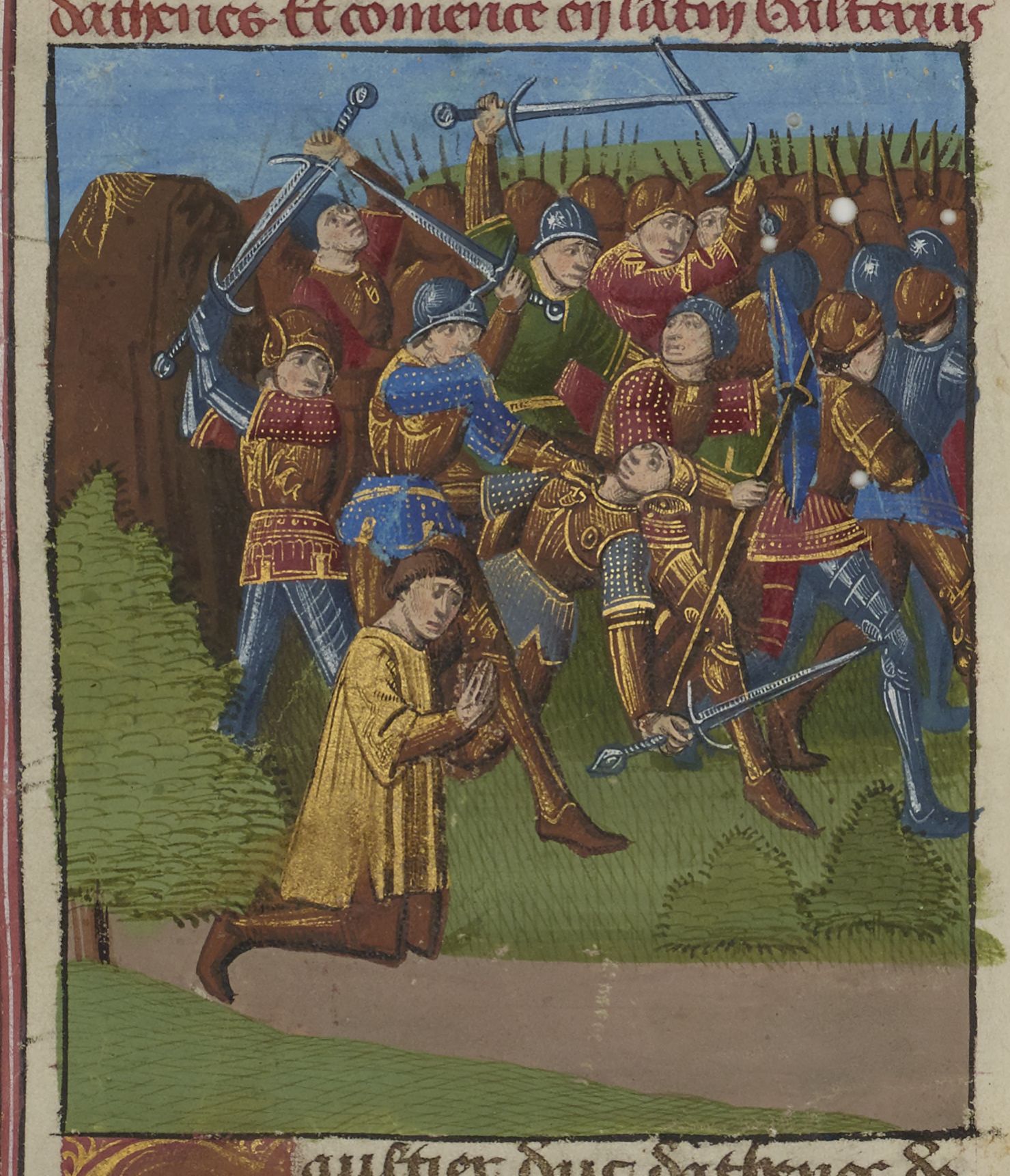 Parigi, Bibliothèque Nationale de France, Fr. 234, f. 199v. Gualtieri di Brienne, duca d'Atene, viene ucciso nella battaglia di Poitiers.
