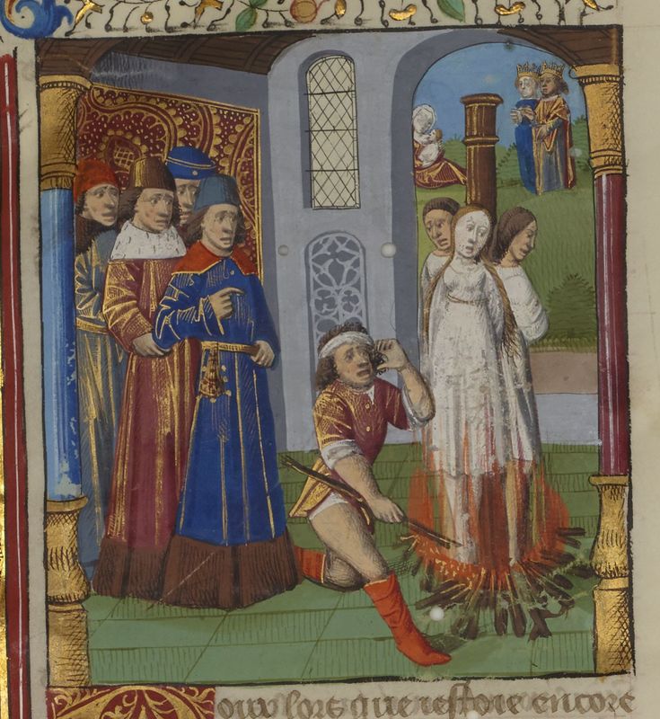 Parigi, Bibliothèque Nationale de France, Fr. 234, f. 203v. Un gruppo di uomini assiste all'esecuzione di Filippa da Catania, arsa sul rogo con i due figli Roberto e Sancia; sullo sfondo, il re Roberto d'Angiò e la moglie Violante osservano Filippa allattare il principe Ludovico.