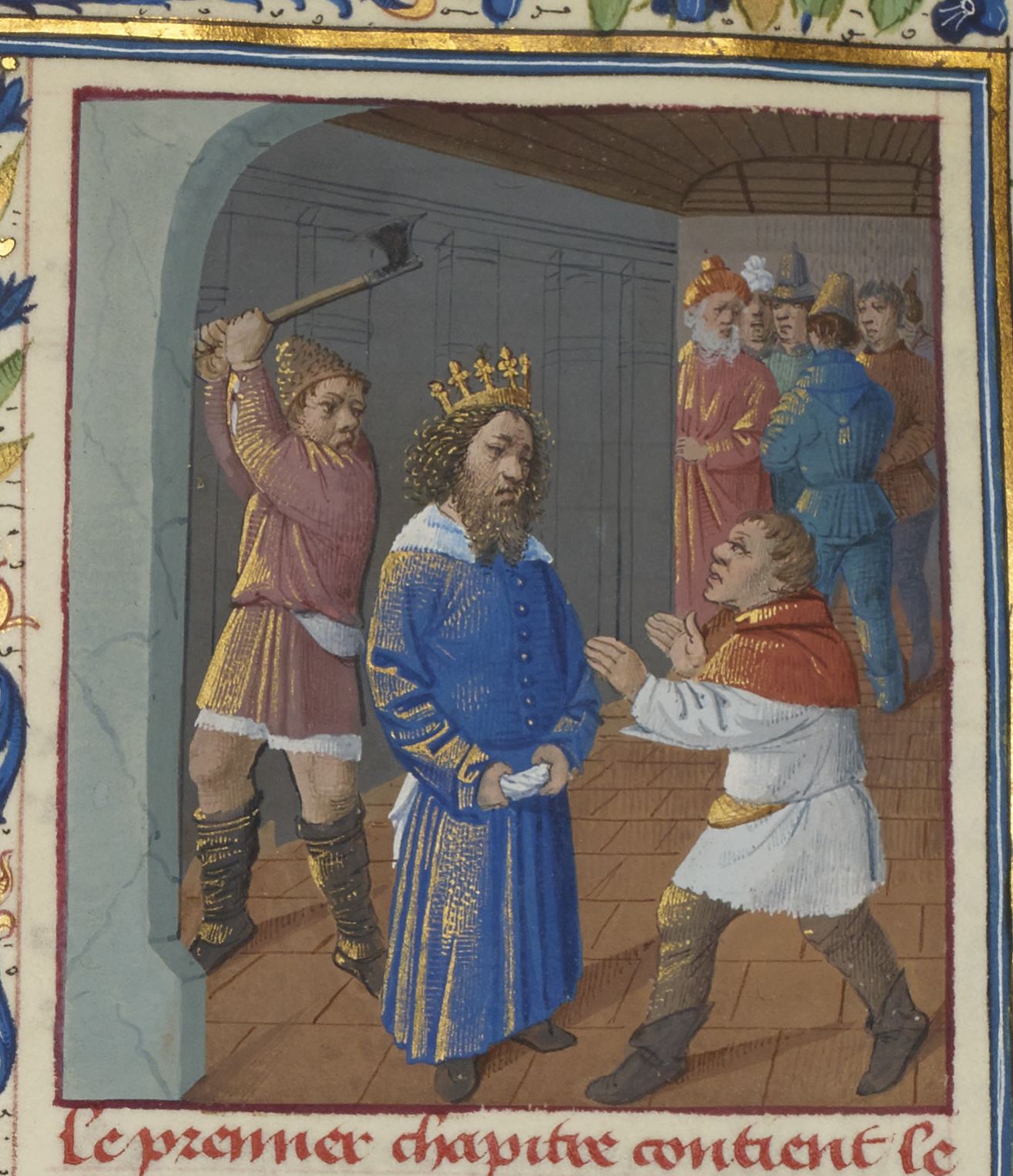 Parigi, Bibliothèque Nationale de France, Fr. 227, f. 79r. Lucio Tarquinio Prisco viene ucciso dai figli di Anco Marzio.