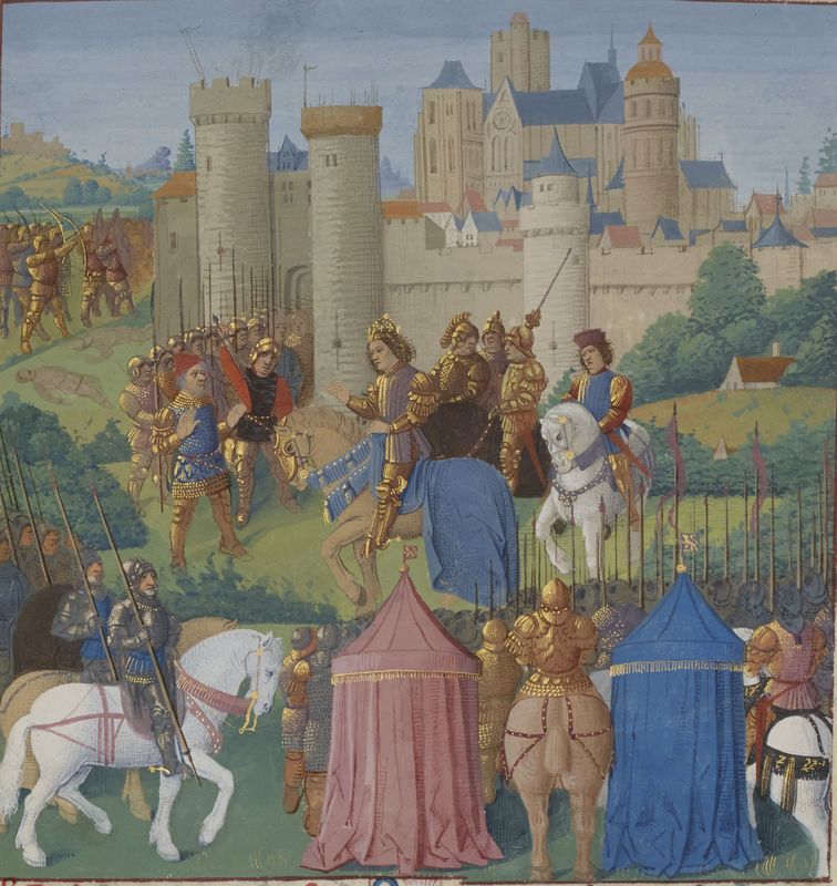 Parigi, Bibliothèque Nationale de France, Fr. 227, f. 300r. L'imperatore Tito e l'esercito romano stringono d'assedio la città di Gerusalemme.
