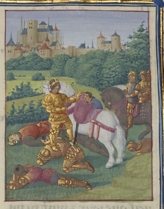 Parigi, Bibliothèque Nationale de France, Fr. 227, f. 307r. Re Sapore monta a cavallo usando la schiena di Valeriano come predellino.