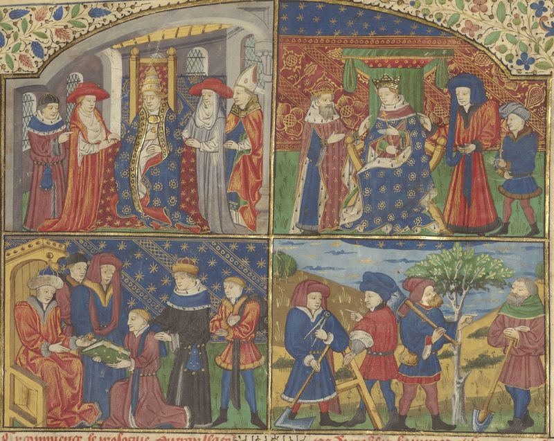 Parigi, Bibliothèque de l'Arsenal, 5191, f. 1r. La miniatura è divisa in quattro riquadri: in alto a sinistra il Papa in trono circondato da esponenti del clero; in alto a destra re Carlo VI assiso in trono circondato dai nobili della corte; in basso a sinistra Laurent de Premierfat inginocchiato presenta il libro al duca di Berry; in basso a destra un gruppo di artigiani e contadini rappresentano la classe popolare.