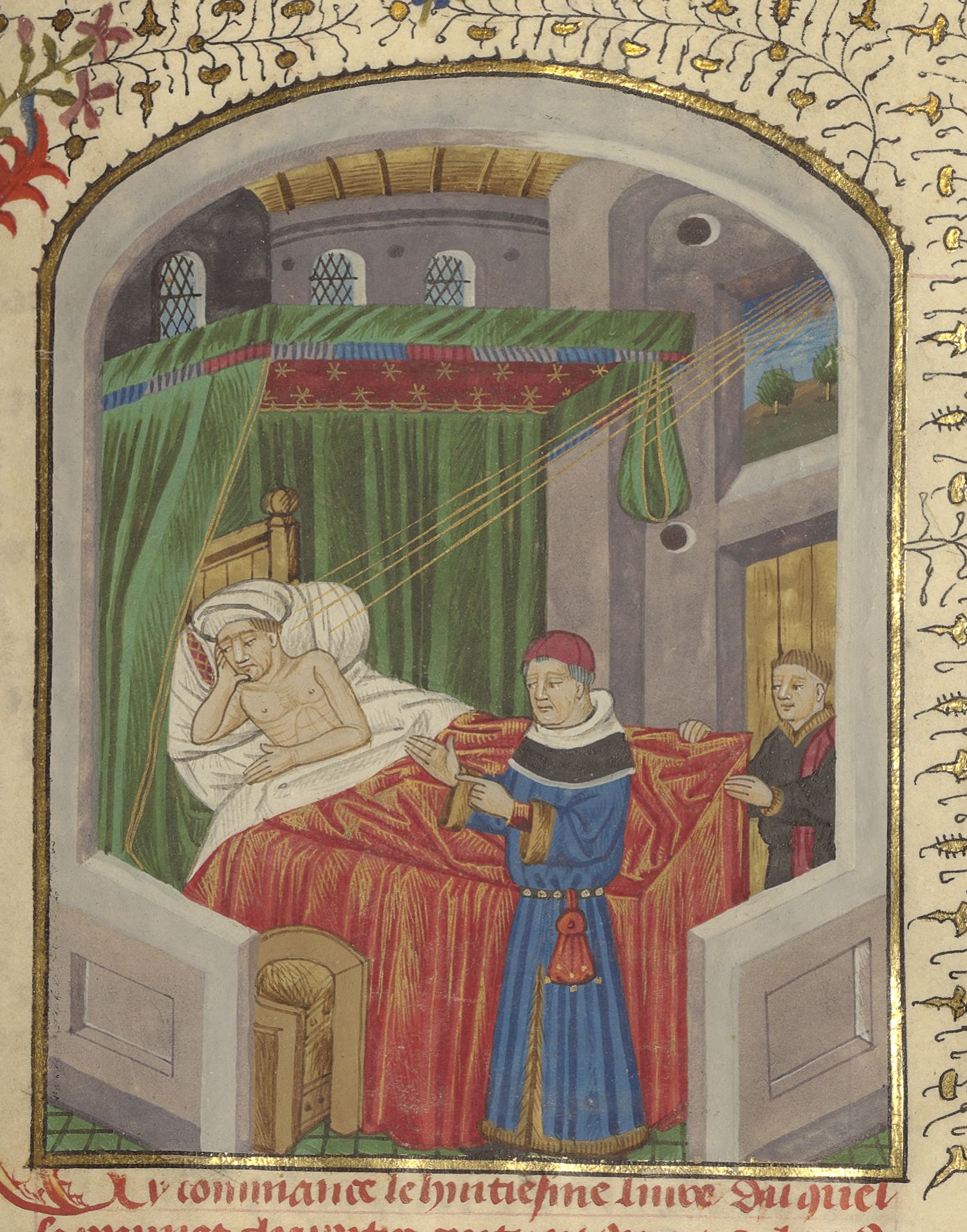Parigi, Bibliothèque de l'Arsenal, 5191, f. 193r. Francesco Petrarca appare in sogno a Giovanni Boccaccio.