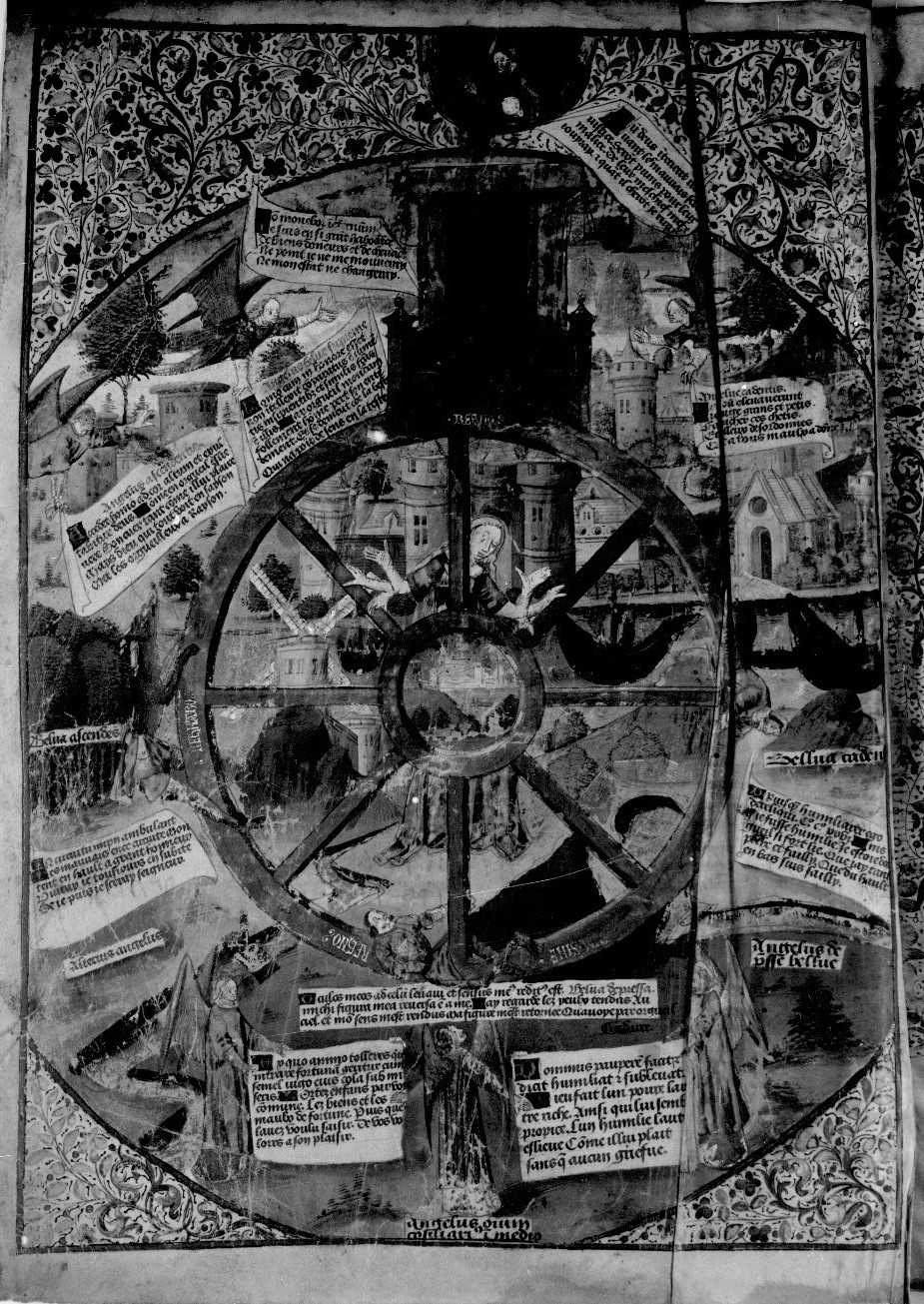 Parigi, Bibliothèque Nationale de France, Fr. 230, f. 1v. Il copista del manoscritto è P. Droulin. La Fortuna, una donna con sei braccia, gira la Ruota che controlla i destini degli uomini, cui sono aggrappati tre personaggi metà uomini e metà animali; in alto il busto di Dio Padre si affaccia tra le nubi, mentre alcuni angeli indicano la scena.