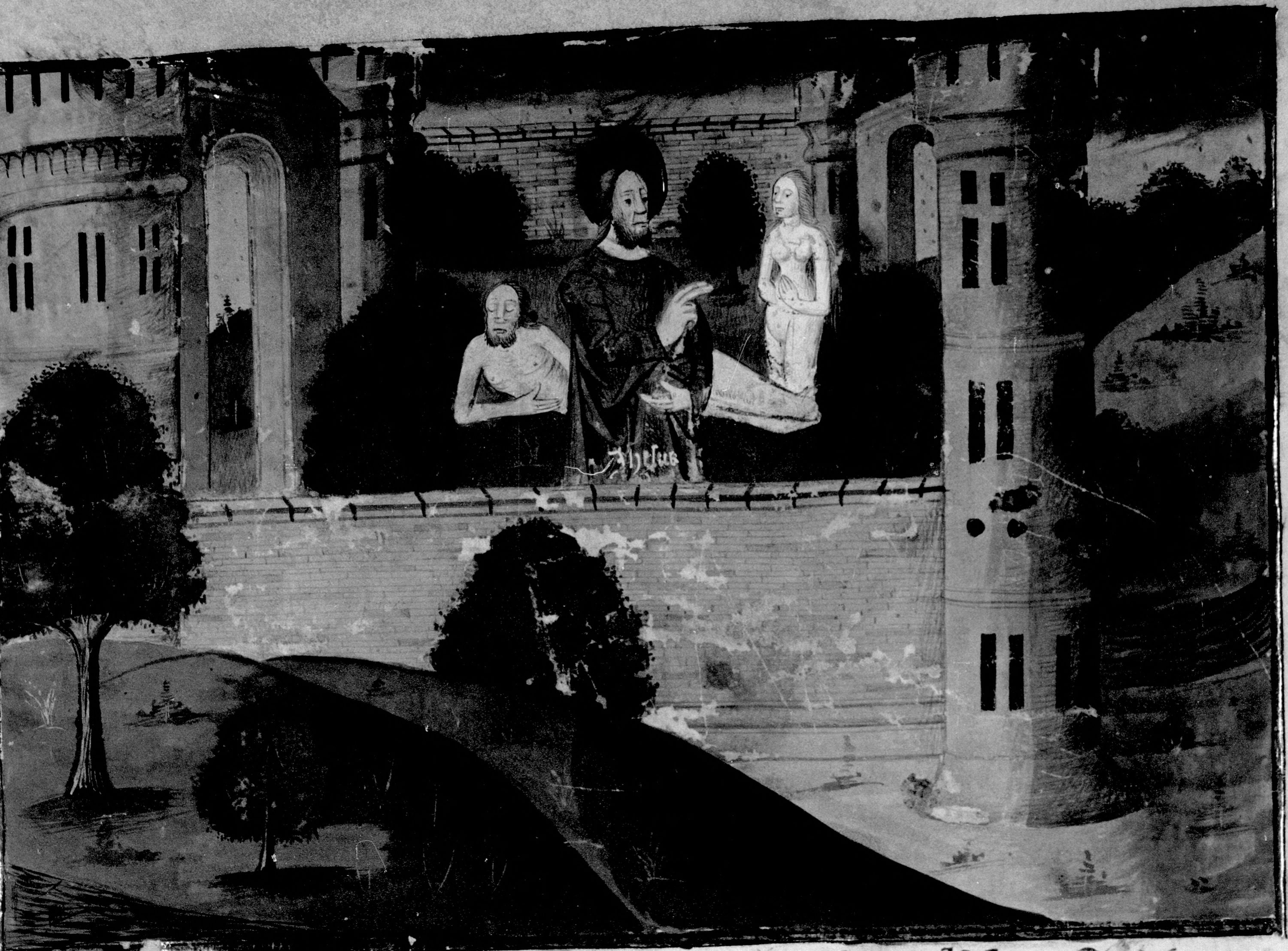 Parigi, Bibliothèque Nationale de France, Fr. 230, f. 4r. Il copista del manoscritto è P. Droulin. Nel Giardino dell'Eden Dio crea Eva dalla costola di Adamo addormentato.
