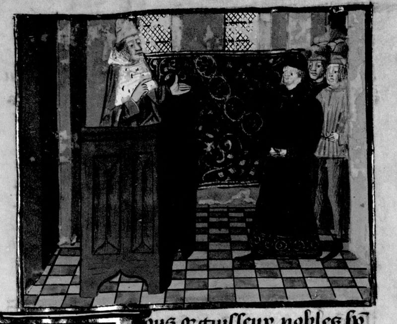 Parigi, Bibliothèque Nationale de France, Fr. 230, f. 7r. Il copista del manoscritto è P. Droulin. Giovanni Boccaccio si rivolge da un pulpito ad alcuni uomini.