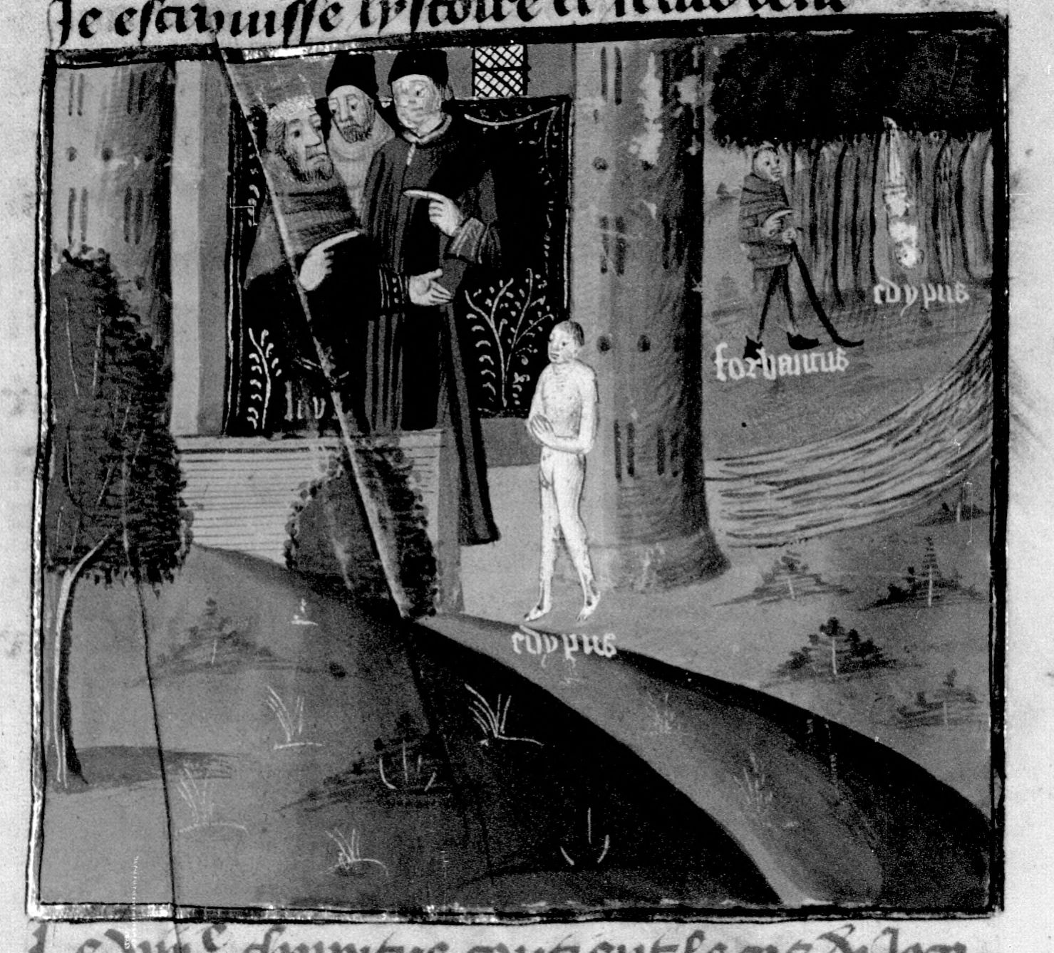 Parigi, Bibliothèque Nationale de France, Fr. 230, f. 11r. Il copista del manoscritto è P. Droulin. Re Laio conversa con Giovanni Boccaccio; il pastore Forbante slega il piccolo Edipo, appeso ad un albero per i piedi, per portarlo con sé.