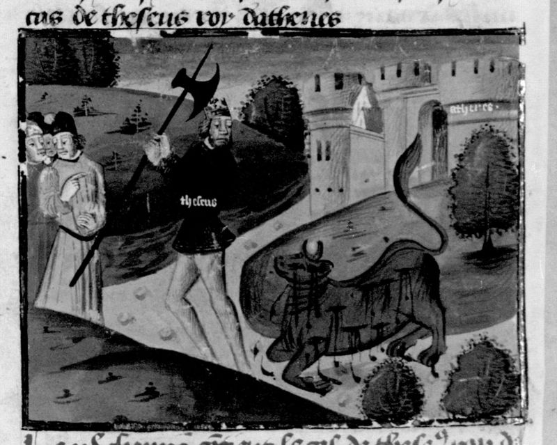 Parigi, Bibliothèque Nationale de France, Fr. 230, f. 13v. Il copista del manoscritto è P. Droulin. Teseo sconfigge il Toro di Maratona.
