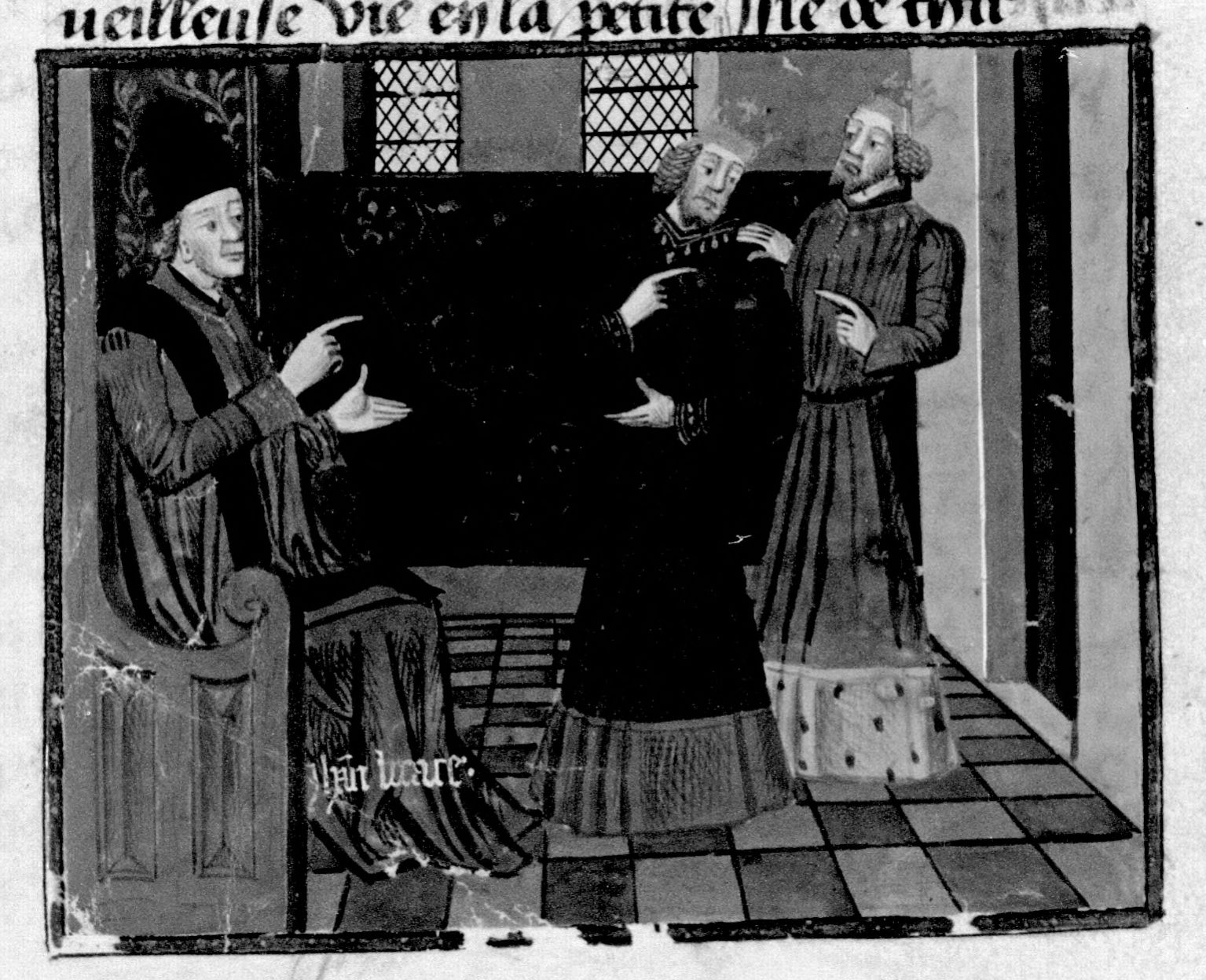 Parigi, Bibliothèque Nationale de France, Fr. 230, f. 15v. Il copista del manoscritto è P. Droulin. Giovanni Boccaccio incontra due sovrani.