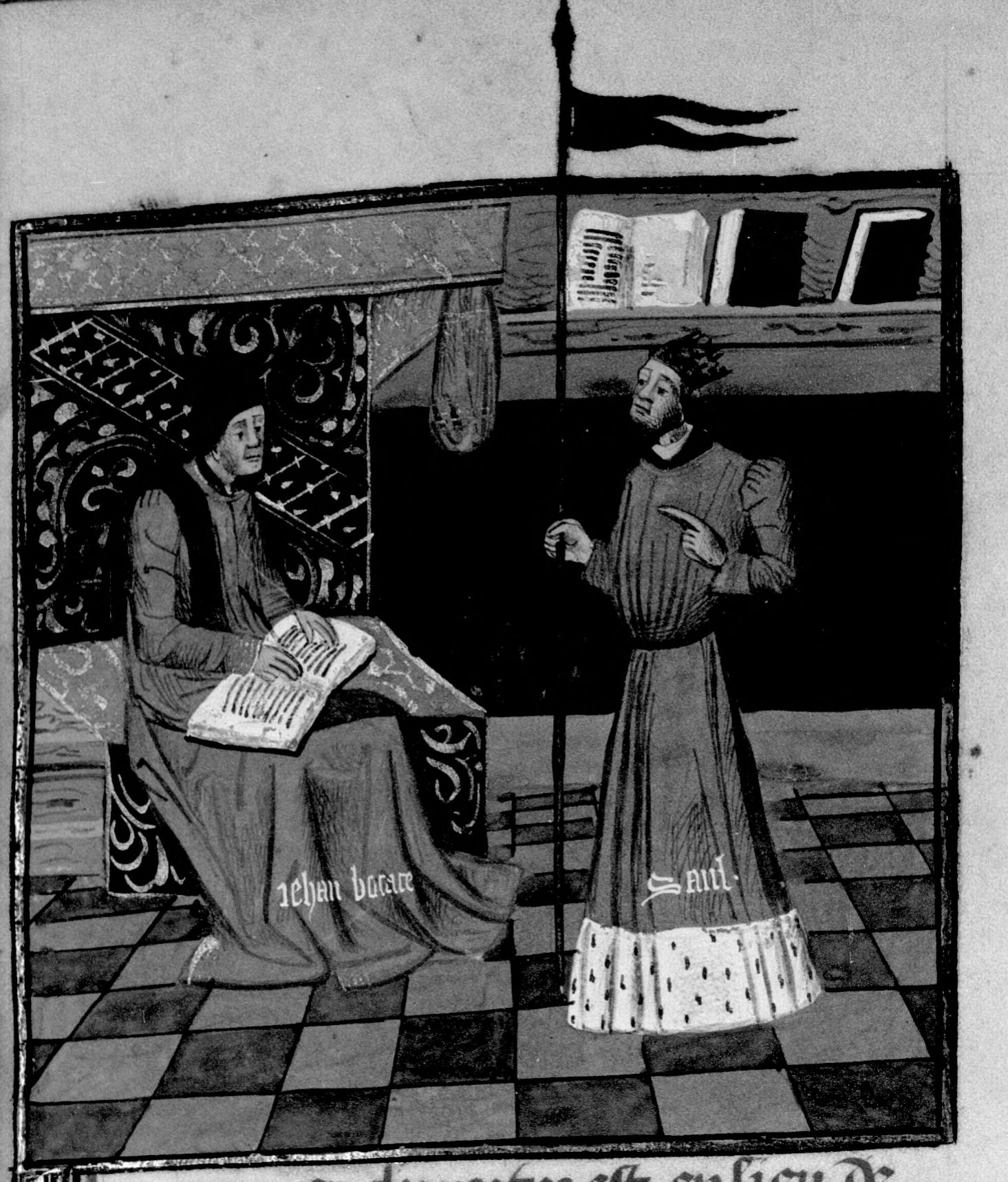 Parigi, Bibliothèque Nationale de France, Fr. 230, f. 31r. Il copista del manoscritto è P. Droulin. Giovanni Boccaccio riceve re Saul.