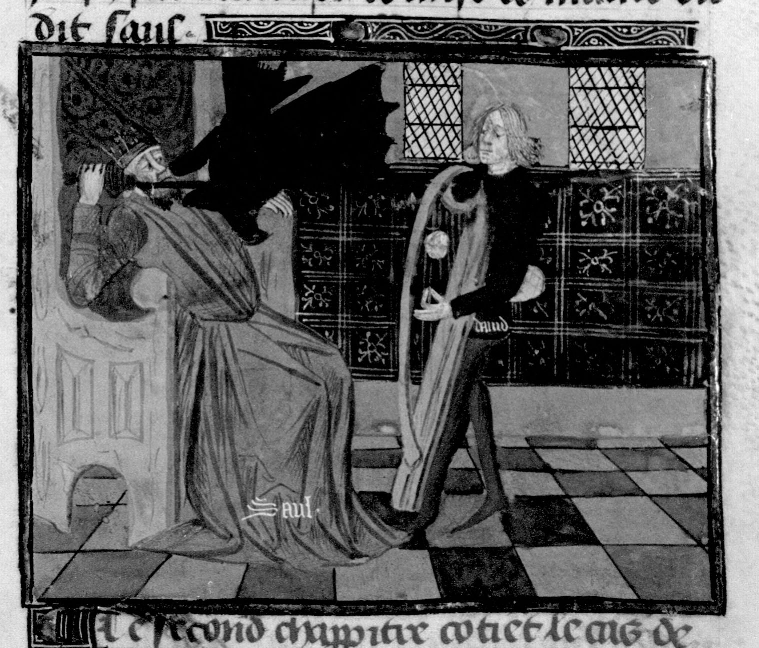 Parigi, Bibliothèque Nationale de France, Fr. 230, f. 31r. Il copista del manoscritto è P. Droulin. Re Saul, seduto sul trono, cerca di colpire il giovane Davide che suona l'arpa.