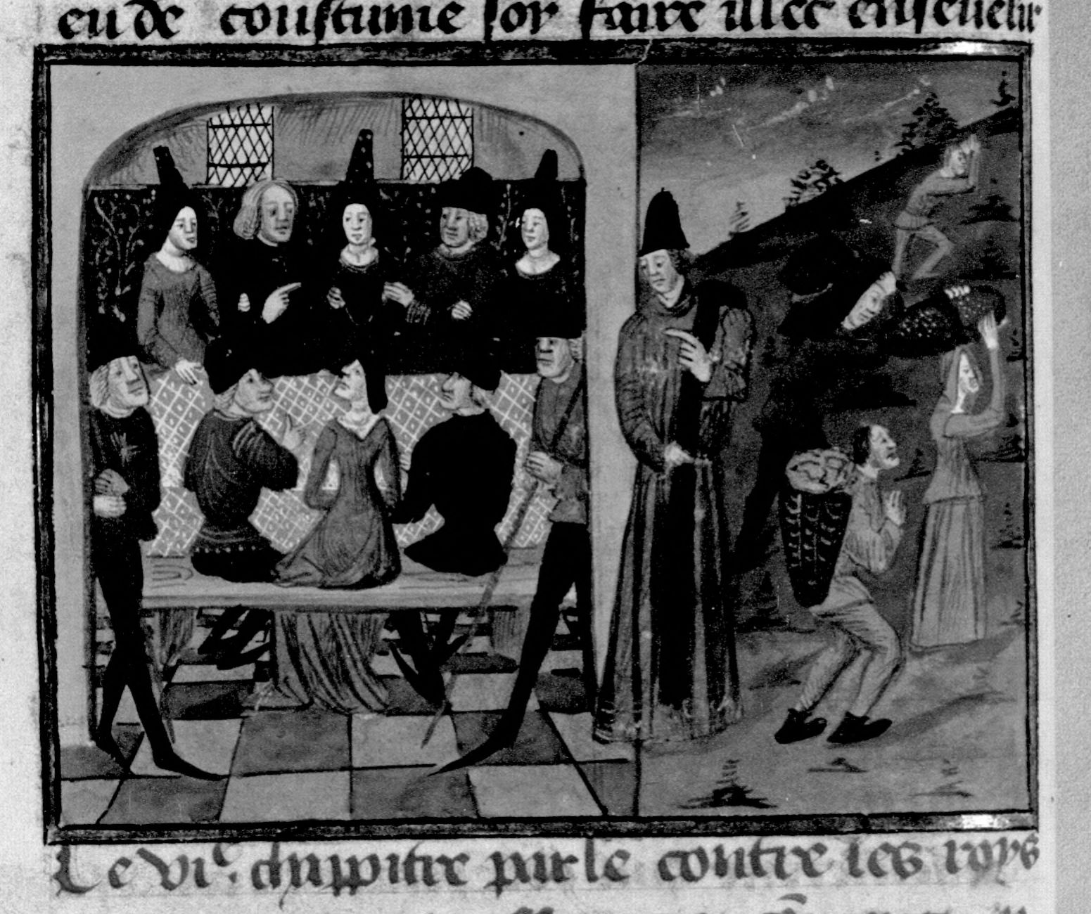 Parigi, Bibliothèque Nationale de France, Fr. 230, f. 34v. Il copista del manoscritto è P. Droulin. Un gruppo di uomini e donne orgogliosi, seduti intorno a un tavolo, vivono del duro lavoro dei poveri.