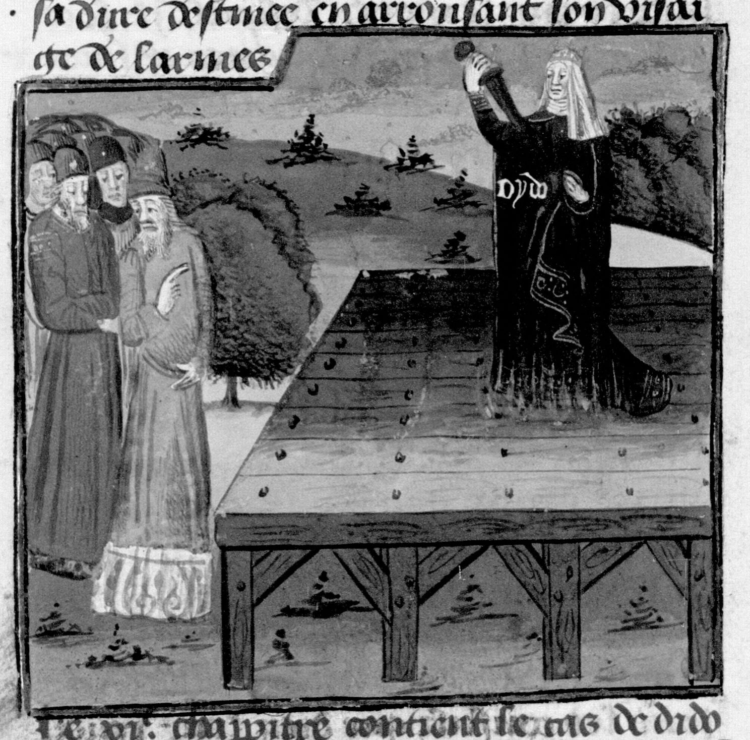 Parigi, Bibliothèque Nationale de France, Fr. 230, f. 39v. Il copista del manoscritto è P. Droulin. La regina Didone compie il suicidio pugnalandosi sulla pira funebre, mentre i cittadini cartaginesi assistono alla scena.