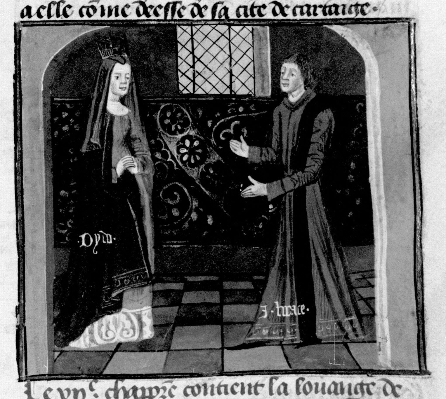 Parigi, Bibliothèque Nationale de France, Fr. 230, f. 42r. Il copista del manoscritto è P. Droulin. La regina Didone compare dinanzi a Giovanni Boccaccio.