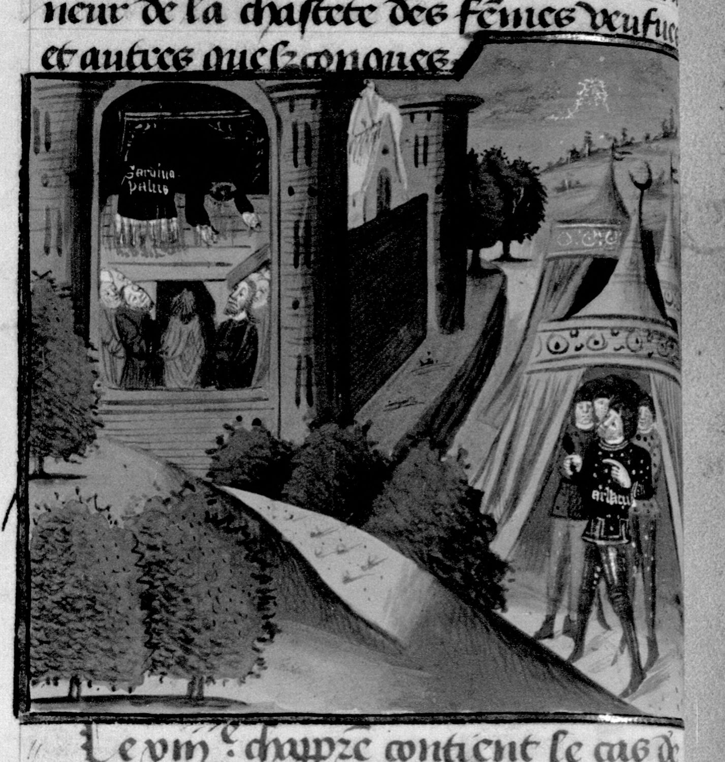 Parigi, Bibliothèque Nationale de France, Fr. 230, f. 42v. Il copista del manoscritto è P. Droulin. Sardanapalo si getta nel rogo del palazzo con i suoi tesori; all'esterno delle mura si trova l'esercito degli assedianti.