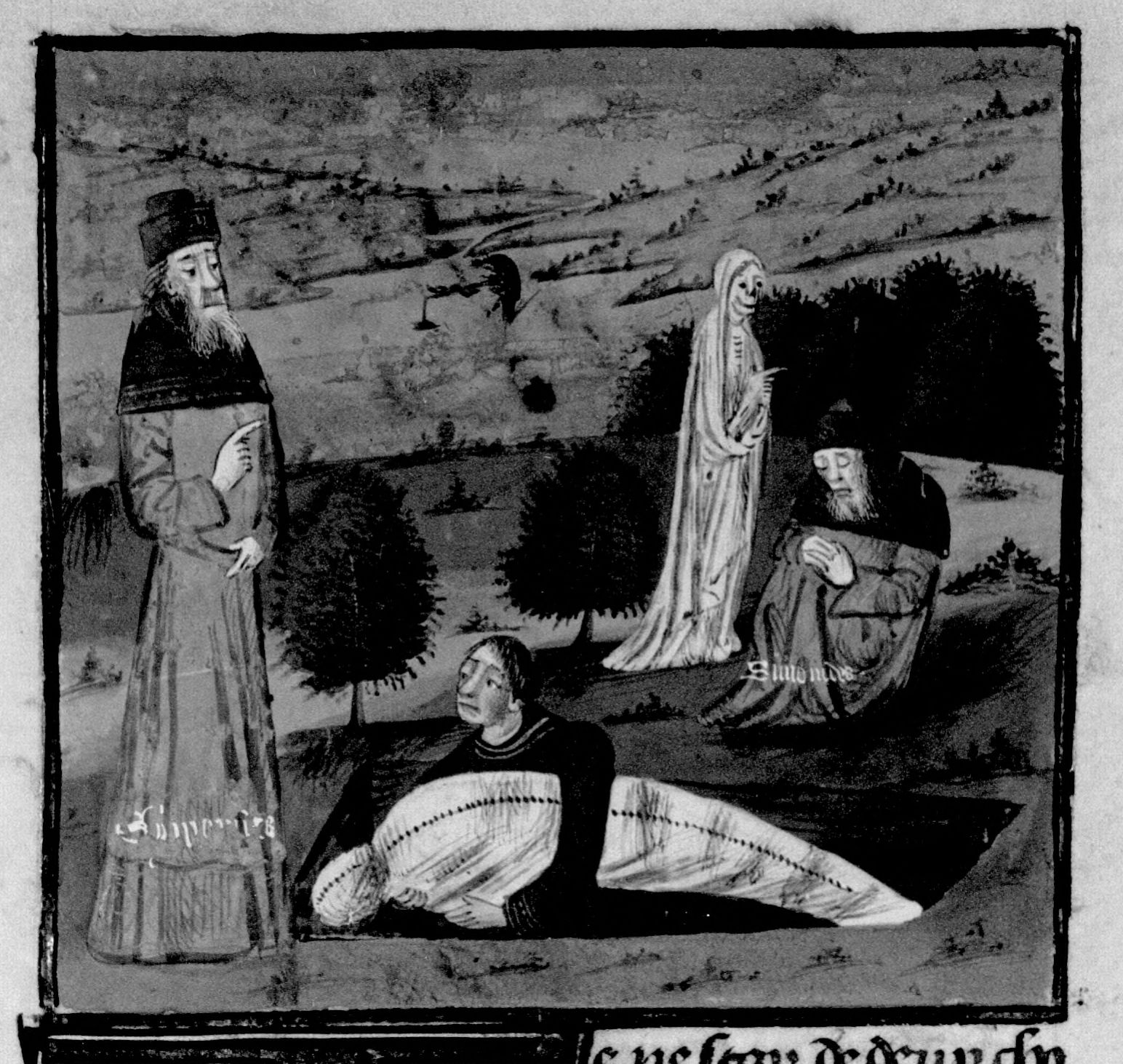 Parigi, Bibliothèque Nationale de France, Fr. 230, f. 52v. Il copista del manoscritto è P. Droulin. Simonide fa sotterrare un cadavere; uno scheletro avvolto in un sudario appare in sogno a Simonide.
