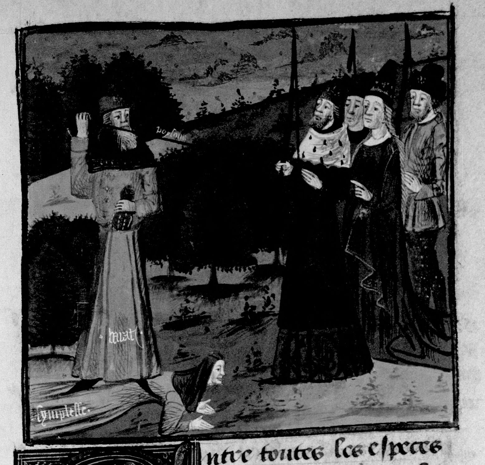 Parigi, Bibliothèque Nationale de France, Fr. 230, f. 60r. Il copista del manoscritto è P. Droulin. Barat calpesta Semplicia.