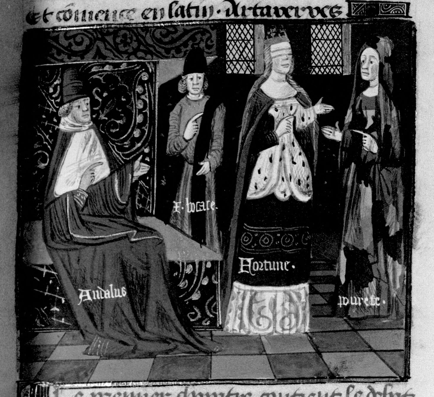 Parigi, Bibliothèque Nationale de France, Fr. 230, f. 61r. Il copista del manoscritto è P. Droulin. Giovanni Boccaccio mostra ad Andalò del Negro la Fortuna bendata e la Povertà vestita di stracci.