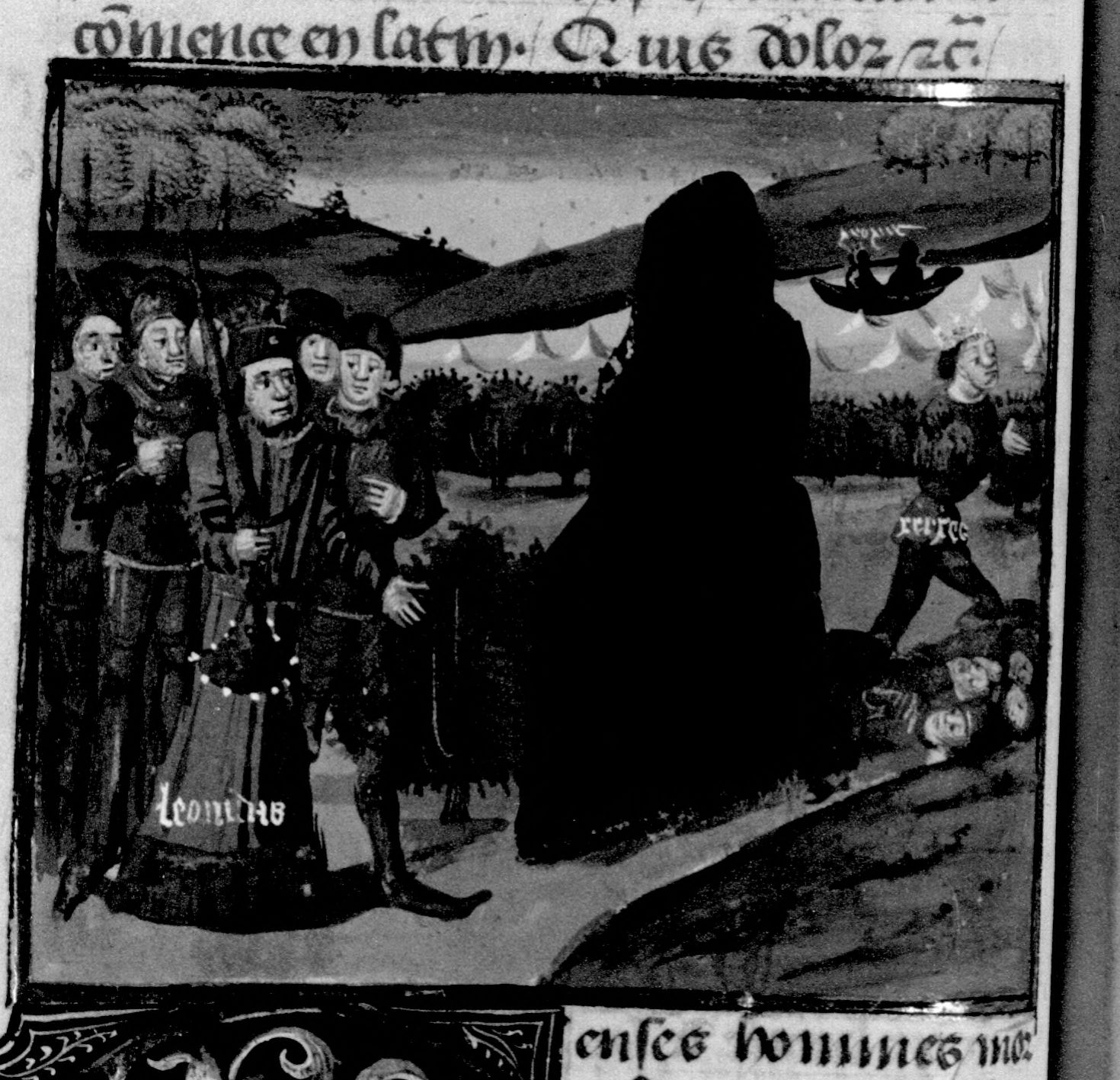 Parigi, Bibliothèque Nationale de France, Fr. 230, f. 76v. Il copista del manoscritto è P. Droulin. Serse, sconfitto e inseguito da Leonida, cerca il guado sull'Ellesponto; Serse attraversa il fiume sulla barca di un pescatore.