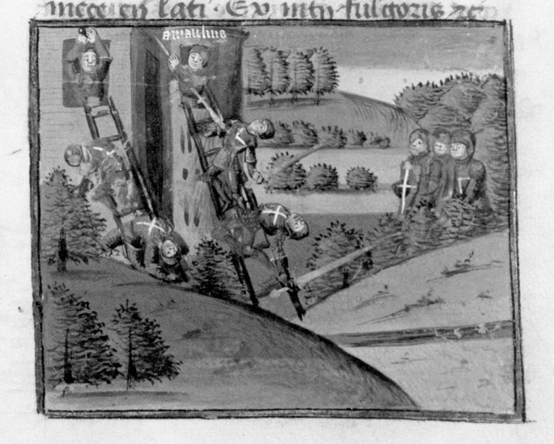 Parigi, Bibliothèque Nationale de France, Fr. 230, f. 95r. Il copista del manoscritto è P. Droulin. Marco Manlio Capitolino respinge l'assedio dei Galli al Campidoglio.