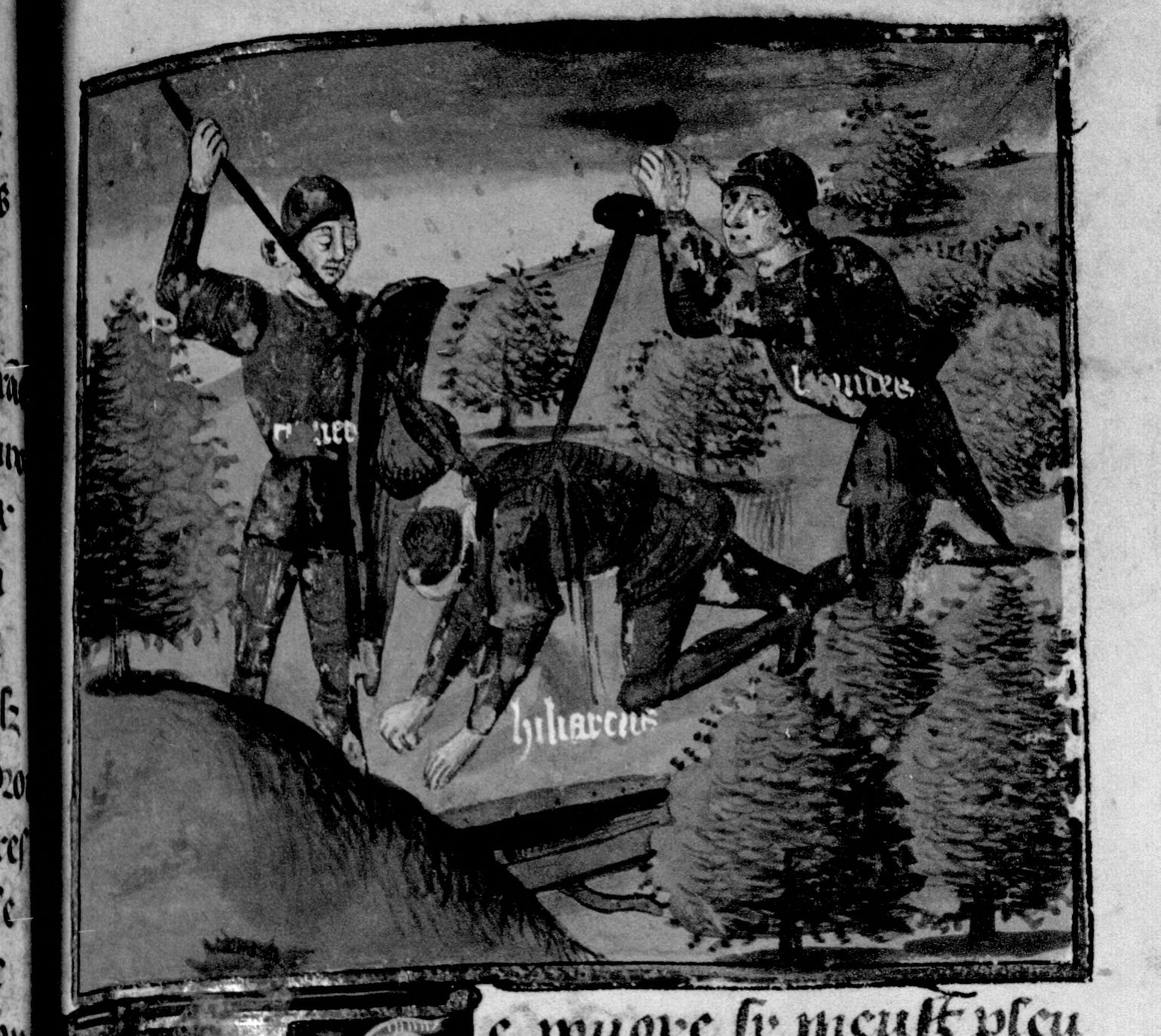 Parigi, Bibliothèque Nationale de France, Fr. 230, f. 98r. Il copista del manoscritto è P. Droulin. Clearco, tiranno di Eraclea, viene assassinato da Chione e Leonide.