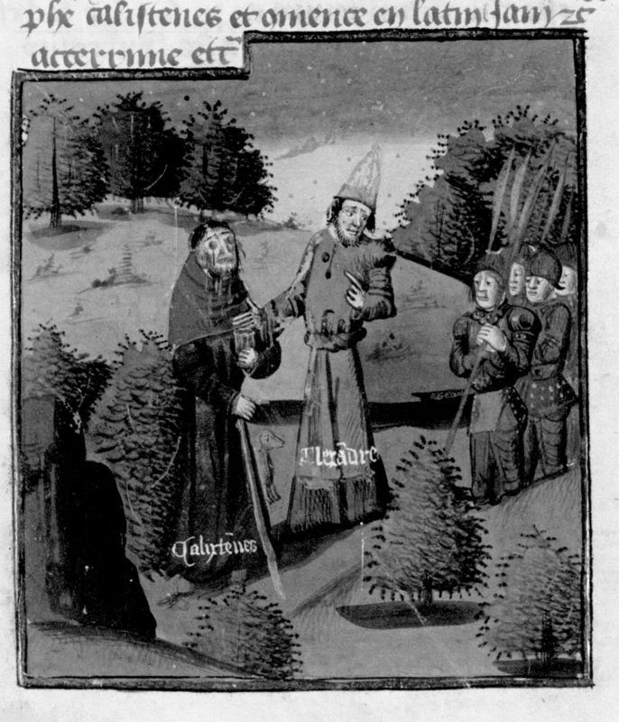 Parigi, Bibliothèque Nationale de France, Fr. 230, f. 101v. Il copista del manoscritto è P. Droulin. Il filosofo Callistene viene accecato.