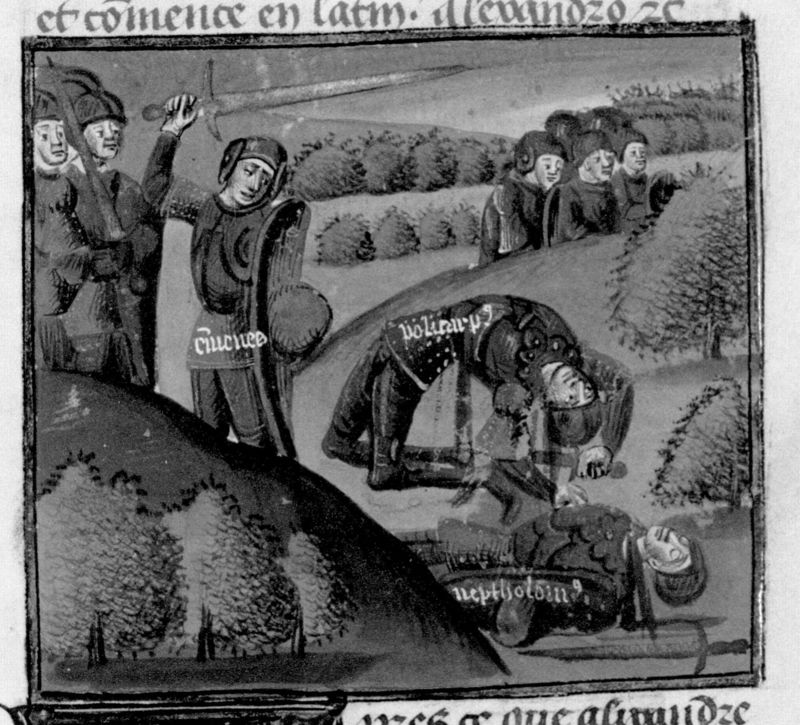 Parigi, Bibliothèque Nationale de France, Fr. 230, f. 109r. Il copista del manoscritto è P. Droulin. Eumene uccide Poliperconte e Neottolemo.