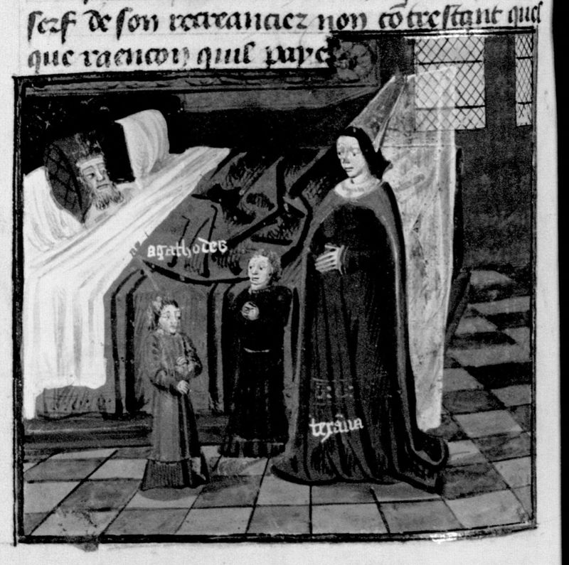 Parigi, Bibliothèque Nationale de France, Fr. 230, f. 112v. Il copista del manoscritto è P. Droulin. Agatocle sul letto di morte ordina alla moglie e ai figli di fuggire in Egitto.