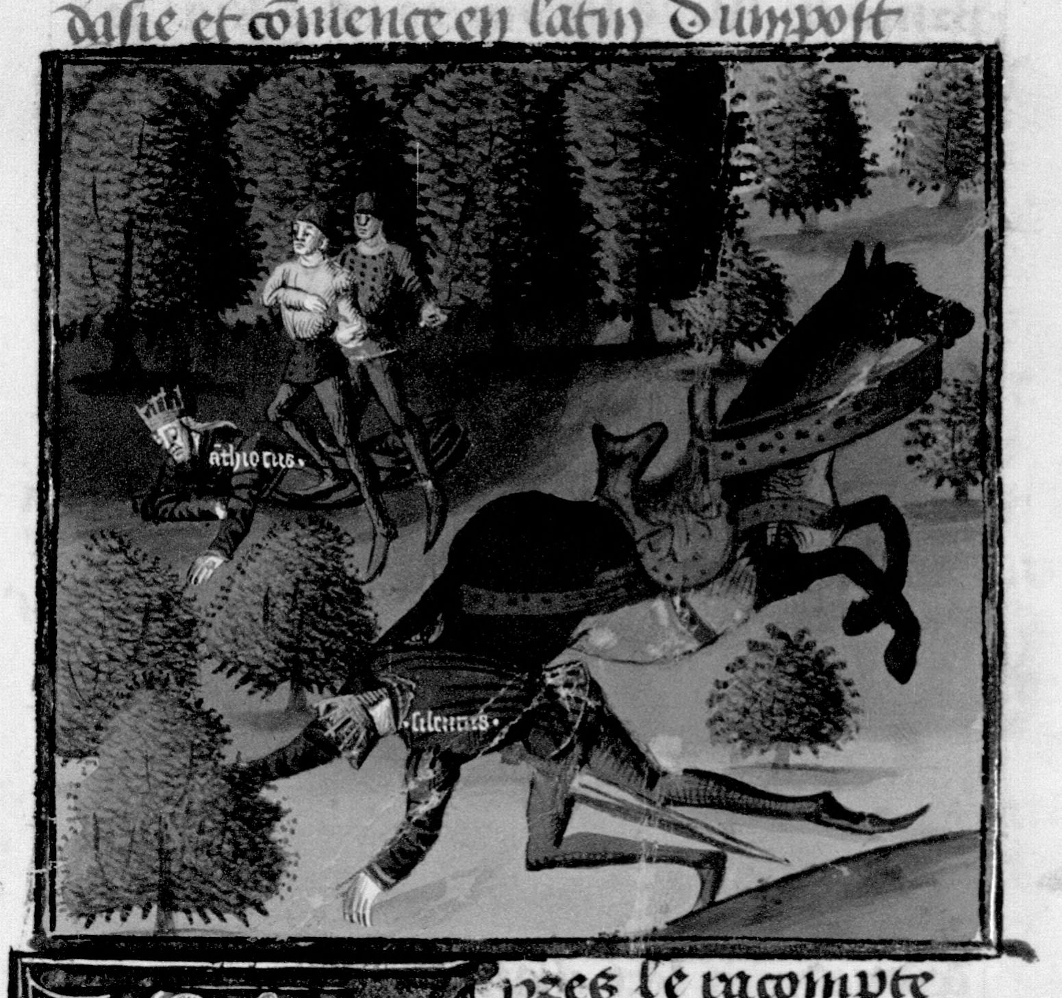 Parigi, Bibliothèque Nationale de France, Fr. 230, f. 127r. Il copista del manoscritto è P. Droulin. Antioco viene ucciso nel bosco dai banditi; Seleuco cade da cavallo.