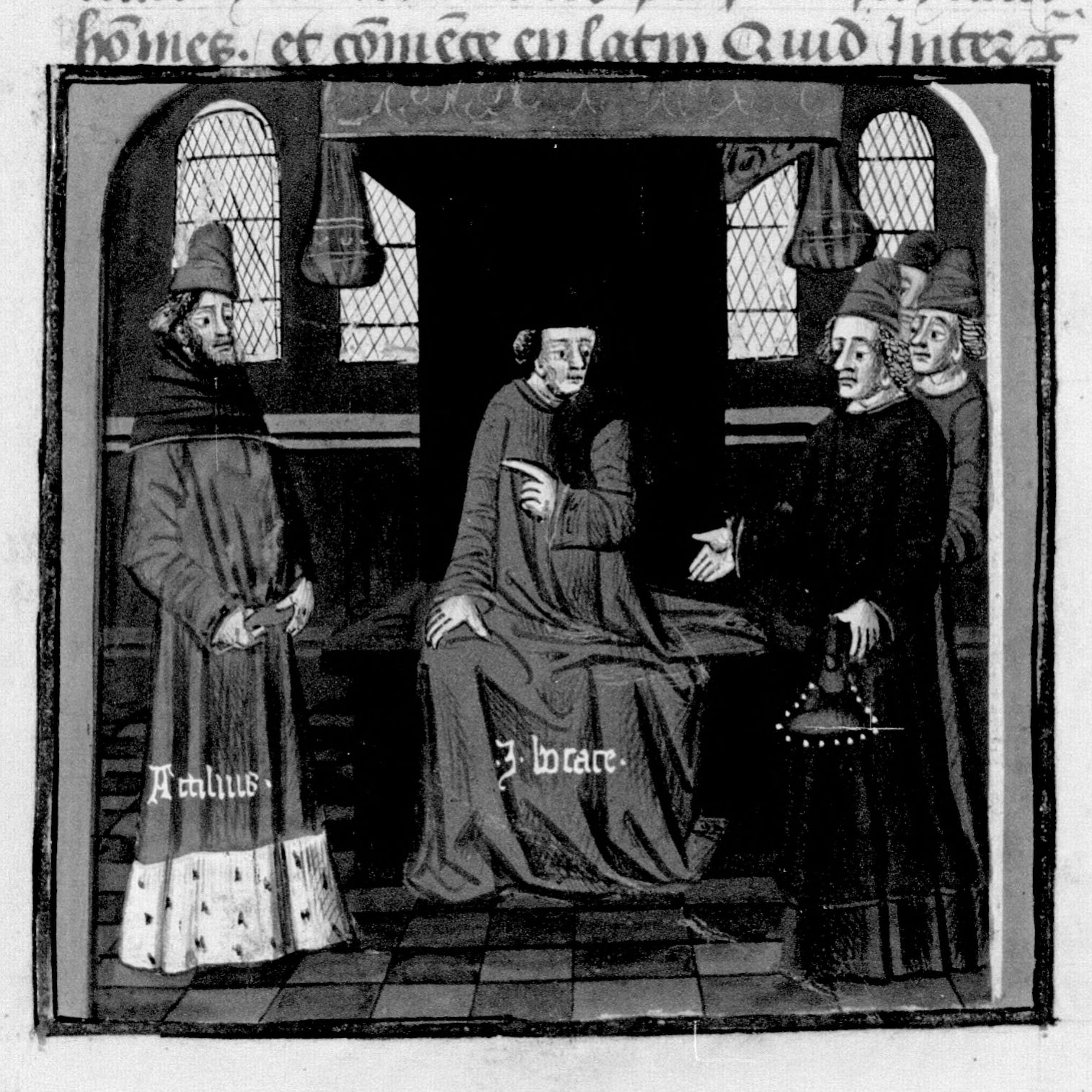 Parigi, Bibliothèque Nationale de France, Fr. 230, f. 132v. Il copista del manoscritto è P. Droulin. Giovanni Boccaccio e Attilio Regolo incontrano un gruppo di uomini colpiti dalla sfortuna.