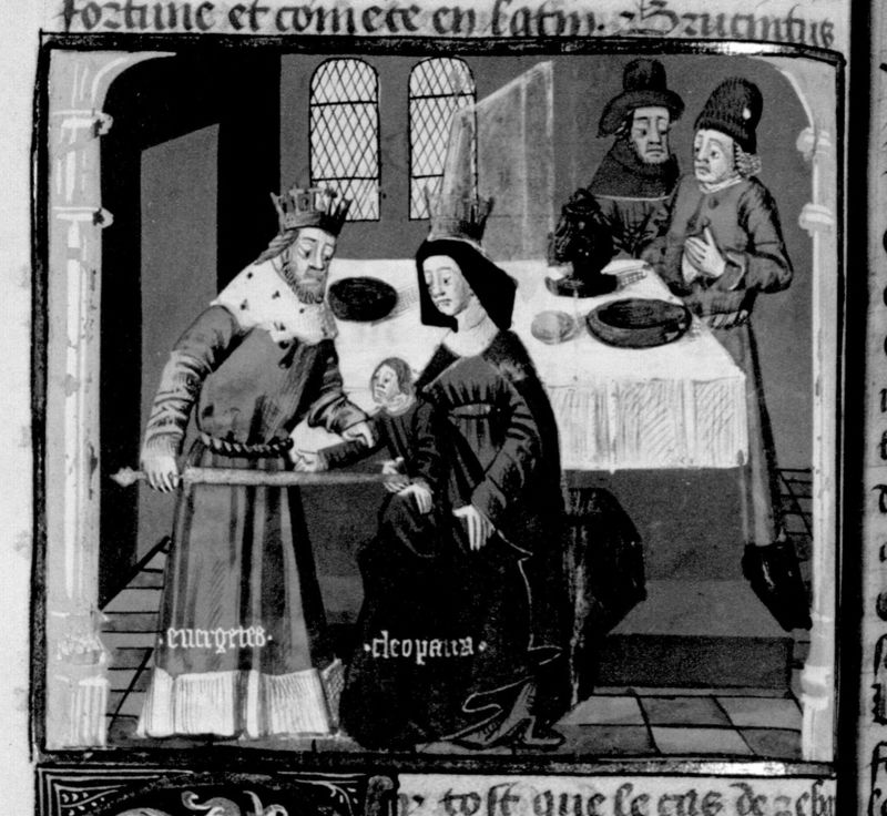 Parigi, Bibliothèque Nationale de France, Fr. 230, f. 152v. Il copista del manoscritto è P. Droulin. Tolomeo Evergete uccide il figlio di Cleopatra II.