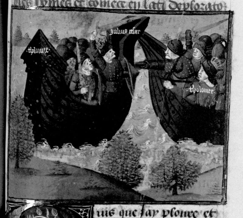 Parigi, Bibliothèque Nationale de France, Fr. 230, f. 176r. Il copista del manoscritto è P. Droulin. La battaglia navale tra Giulio Cesare e Tolomeo.
