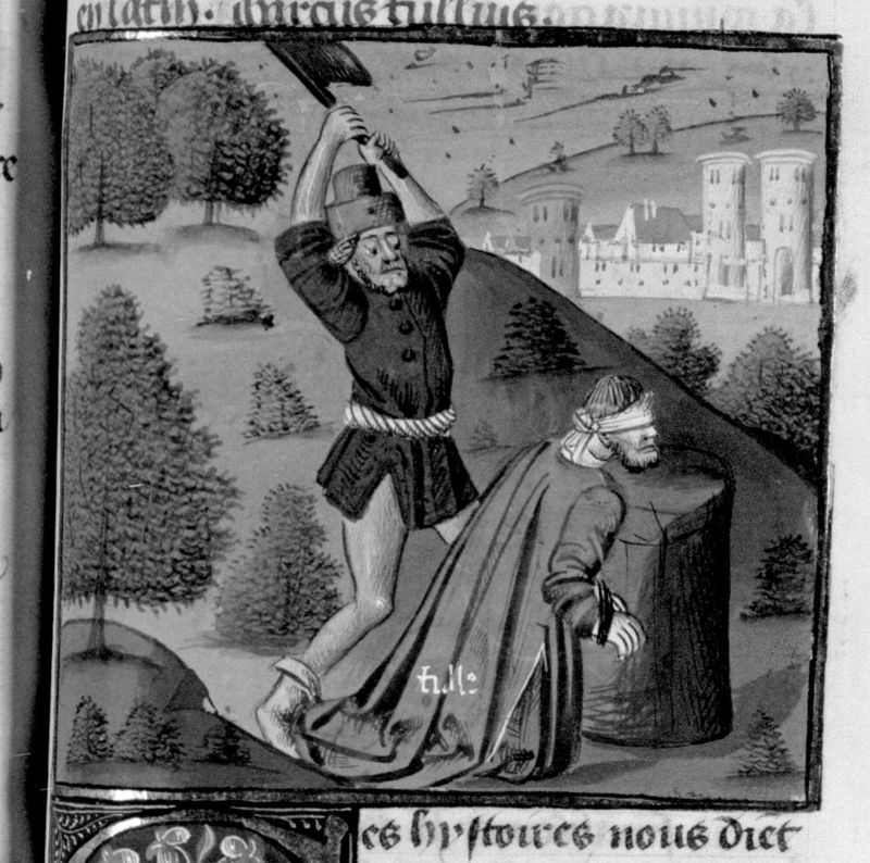 Parigi, Bibliothèque Nationale de France, Fr. 230, f. 179r. Il copista del manoscritto è P. Droulin. Cicerone viene decapitato da un sicario di Marco Antonio.