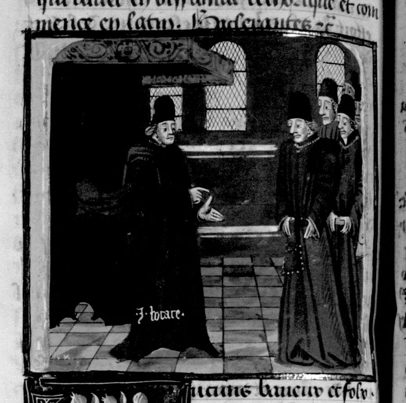 Parigi, Bibliothèque Nationale de France, Fr. 230, f. 181v. Il copista del manoscritto è P. Droulin. Giovanni Boccaccio incontra un gruppo di uomini sfortunati.
