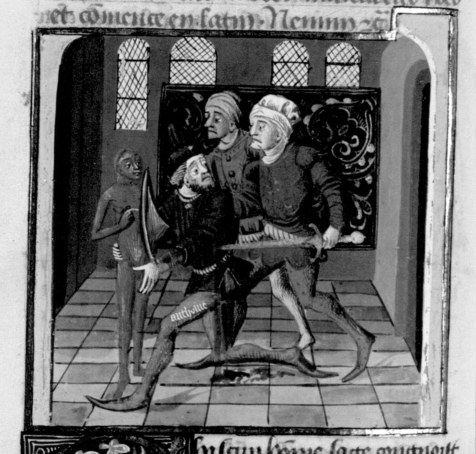 Parigi, Bibliothèque Nationale de France, Fr. 230, f. 186v. Il copista del manoscritto è P. Droulin. Marco Antonio Minore viene assassinato mentre tenta di ripararsi dietro una statua di Giulio Cesare.