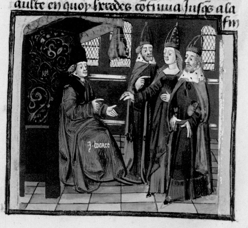 Parigi, Bibliothèque Nationale de France, Fr. 230, f. 191r. Il copista del manoscritto è P. Droulin. Giovanni Boccaccio si rivolge a Caligola, Tiberio e Messalina.