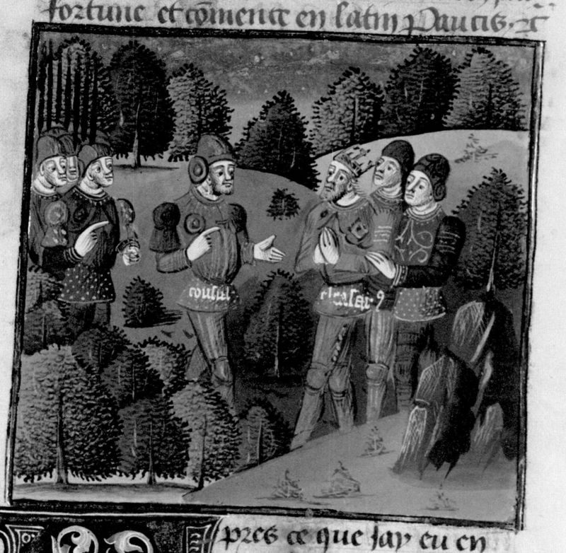 Parigi, Bibliothèque Nationale de France, Fr. 230, f. 200r. Il copista del manoscritto è P. Droulin. Eleazaro viene condotto dinanzi a Felice, governatore della Giudea.