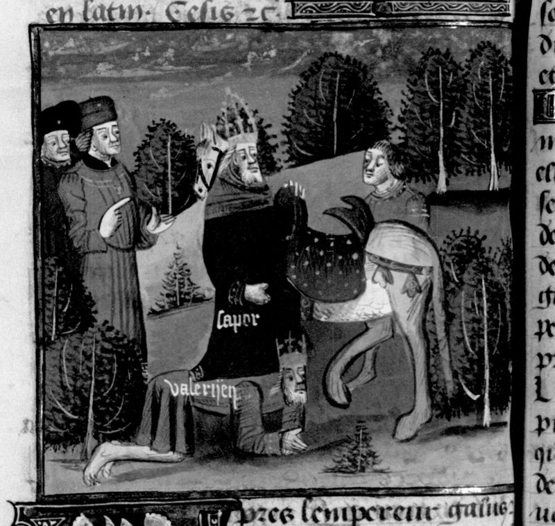 Parigi, Bibliothèque Nationale de France, Fr. 230, f. 213v. Il copista del manoscritto è P. Droulin. Re Sapore monta a cavallo usando la schiena di Valeriano come predellino.