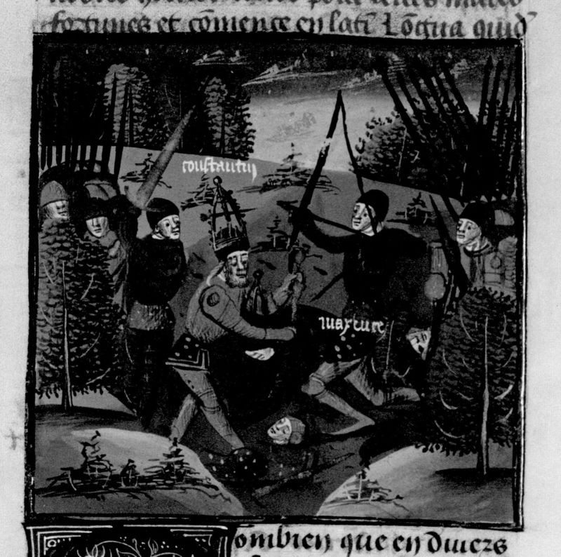 Parigi, Bibliothèque Nationale de France, Fr. 230, f. 223r. Il copista del manoscritto è P. Droulin. L'imperatore Massenzio viene ucciso in battaglia da Costantino.