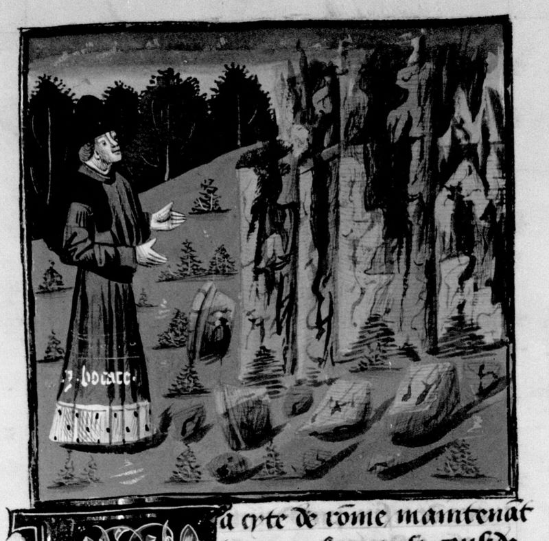 Parigi, Bibliothèque Nationale de France, Fr. 230, f. 234v. Il copista del manoscritto è P. Droulin. Giovanni Boccaccio si trova dinanzi alle rovine di Roma.