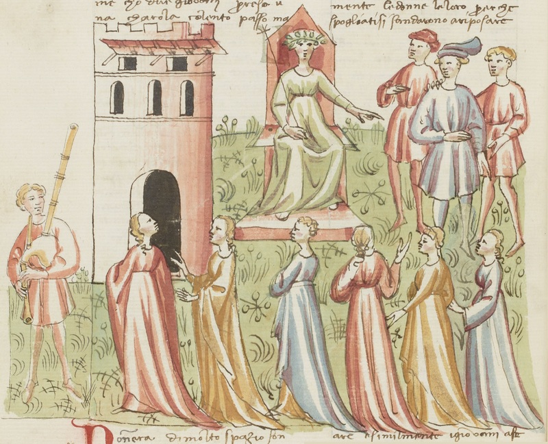 Parigi, Bibliothèque Nationale de France, It. 63, f. 10v. Il copista del manoscritto, datato 10 ottobre 1427, è Ludovico di Salvestro Ceffini. La compagnia dei dieci novellatori, guidati da Pampinea, si appresta a danzare nel giardino accompagnata da un musico.