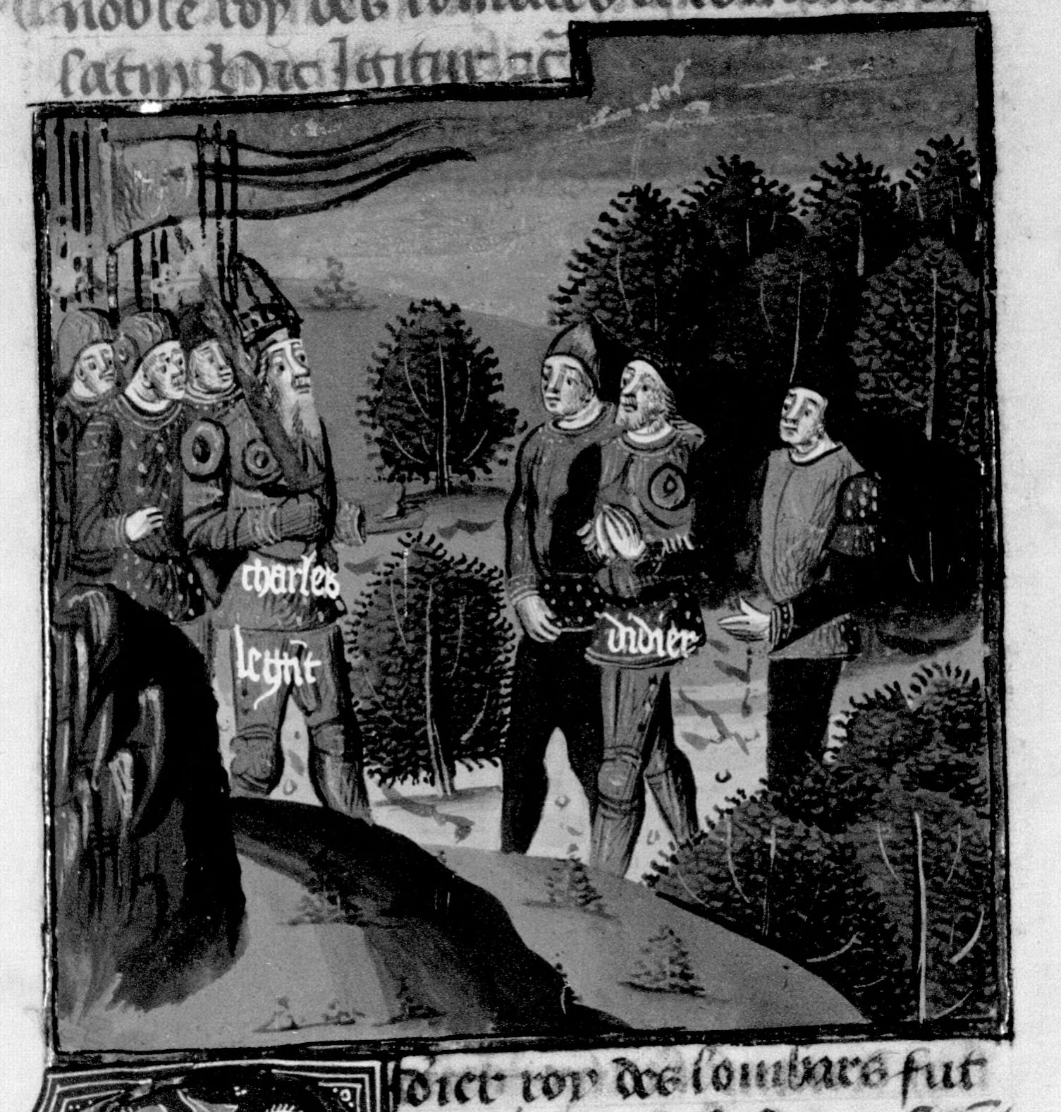 Parigi, Bibliothèque Nationale de France, Fr. 230, f. 250v. Il copista del manoscritto è P. Droulin. Re Desiderio viene preso prigioniero da Carlo Magno.