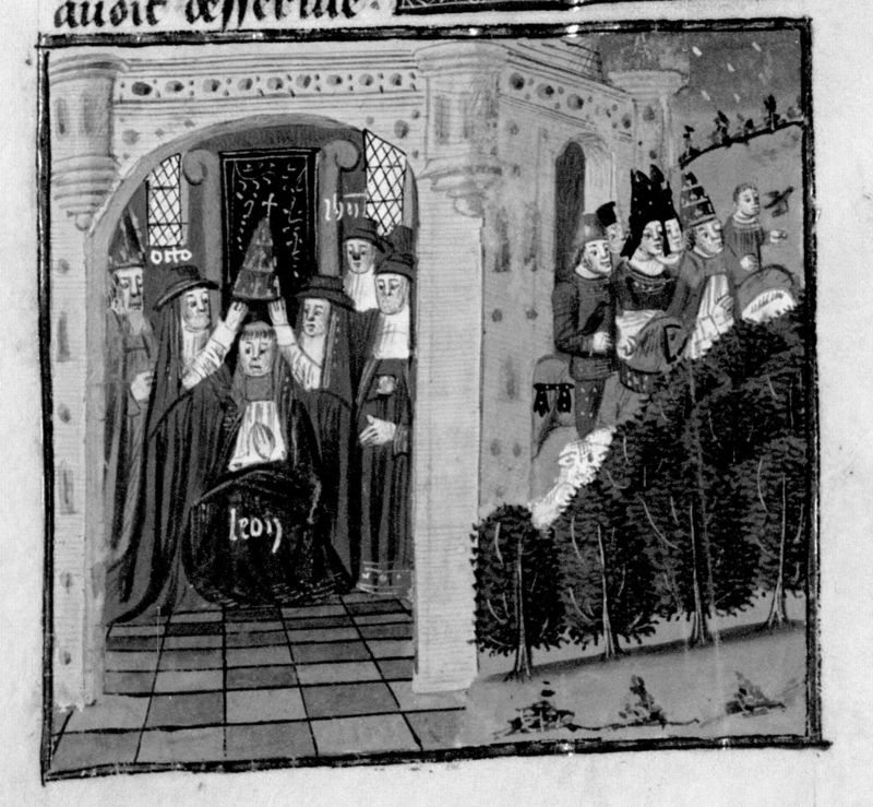 Parigi, Bibliothèque Nationale de France, Fr. 230, f. 252v. Il copista del manoscritto è P. Droulin. Leone IX viene eletto papa; Giovanni XII fugge da Roma.