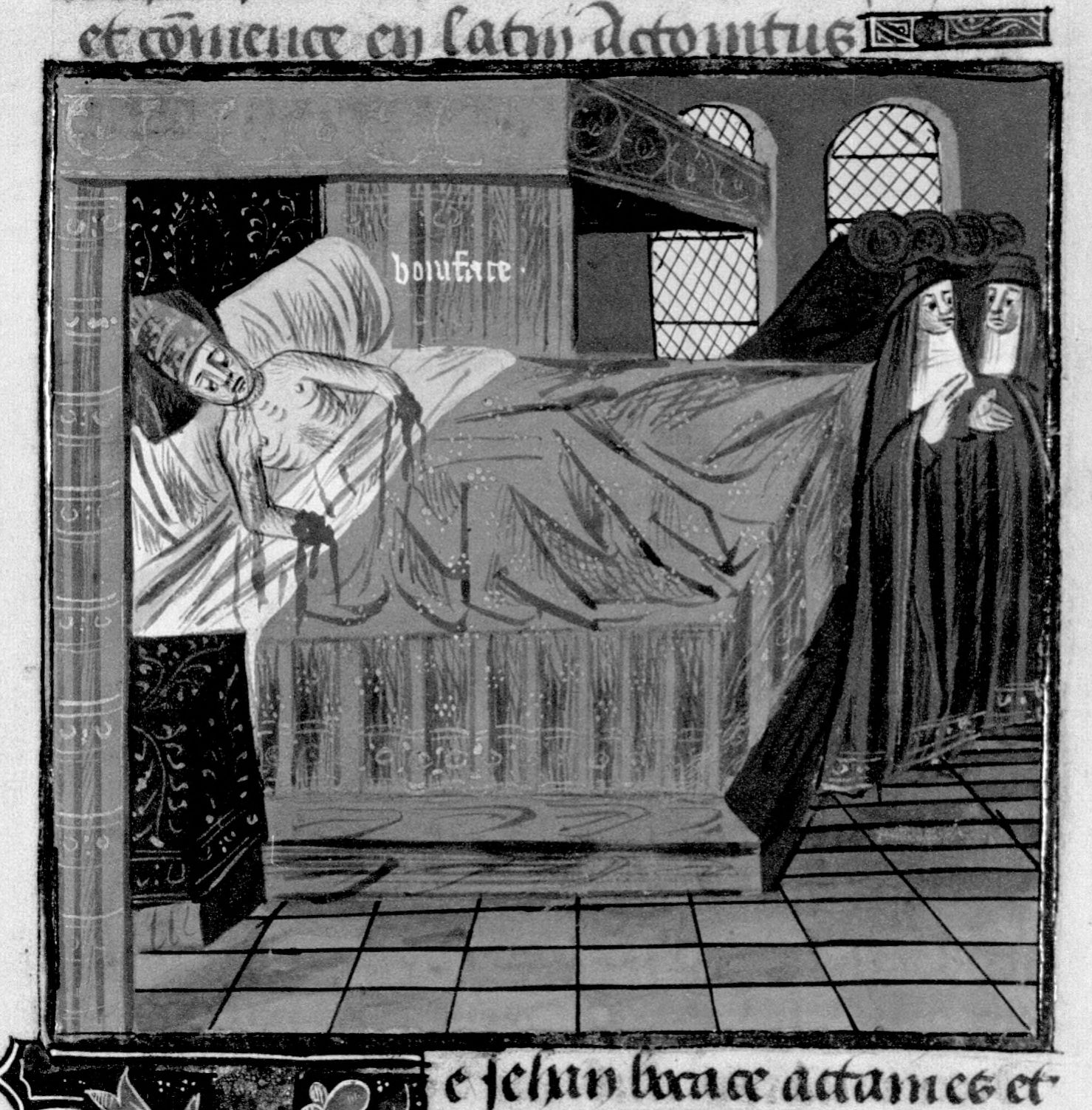 Parigi, Bibliothèque Nationale de France, Fr. 230, f. 263r. Il copista del manoscritto è P. Droulin. Papa Bonifacio VIII giace a letto morente, con le mani consumate fino ai polsi.