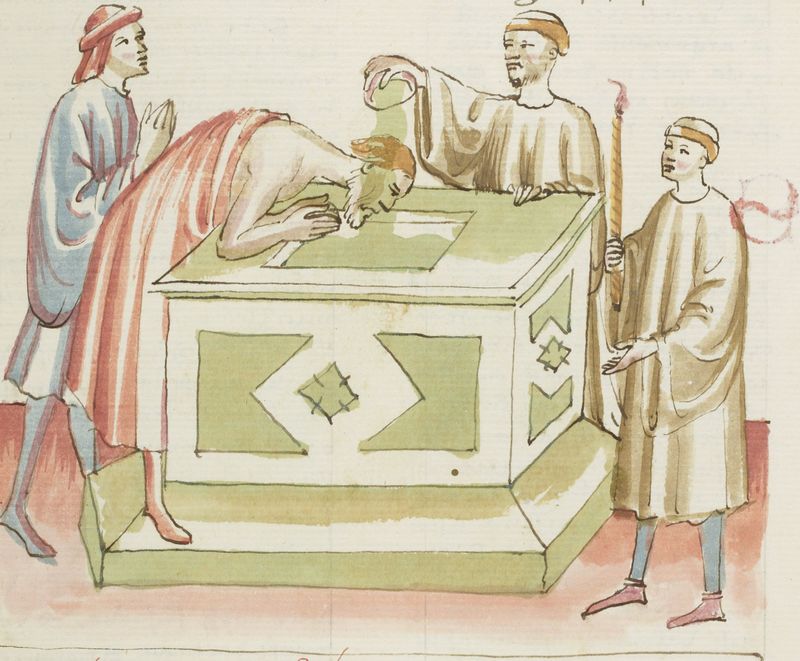 Parigi, Bibliothèque Nationale de France, It. 63, f. 17r. Il copista del manoscritto, datato 10 ottobre 1427, è Ludovico di Salvestro Ceffini. L'ebreo Abraam viene battezzato, accompagnato da Giannotto.