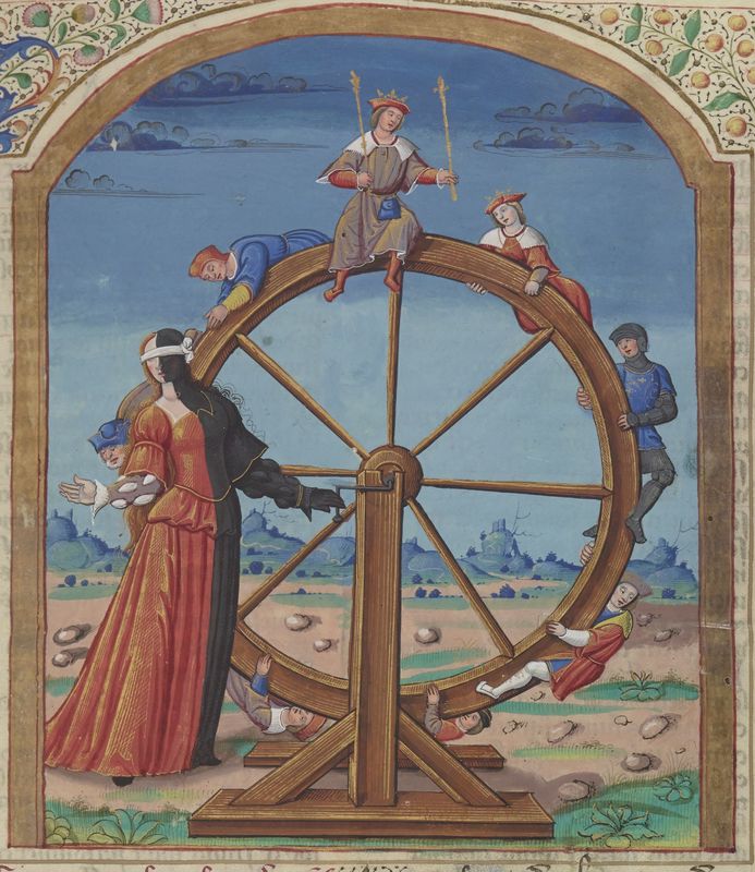 Parigi, Bibliothèque Nationale de France, Fr. 130, f. 1r. La Fortuna, una donna bendata con un lato in ombra ed uno in luce, gira la sua Ruota che determina il destino degli uomini.