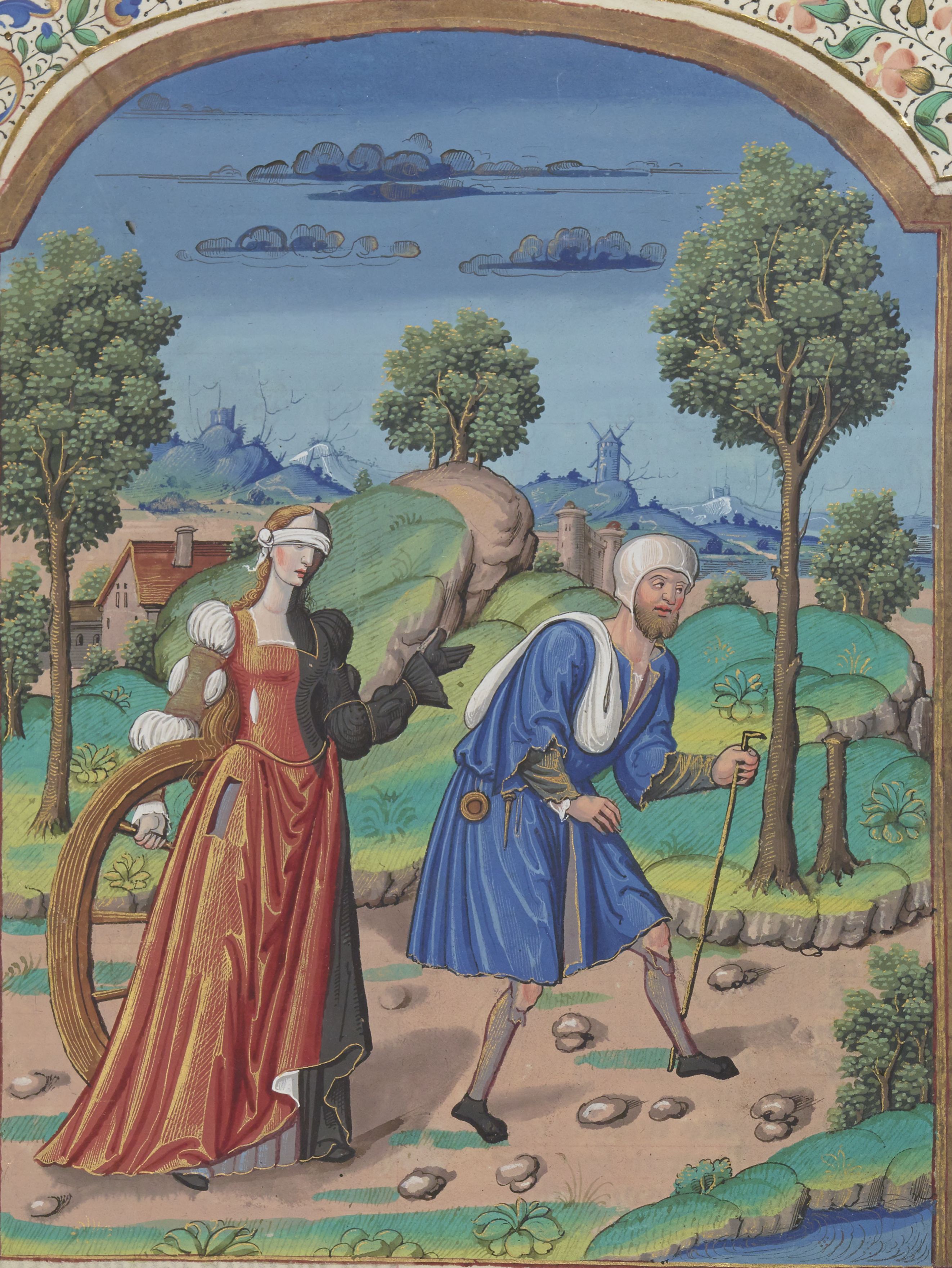 Parigi, Bibliothèque Nationale de France, Fr. 130, f. 88r. La Fortuna, una dama bendata con un lato in ombra e uno in luce, porta la sua Ruota e segue la Povertà, un vecchio col bastone dagli abiti laceri.