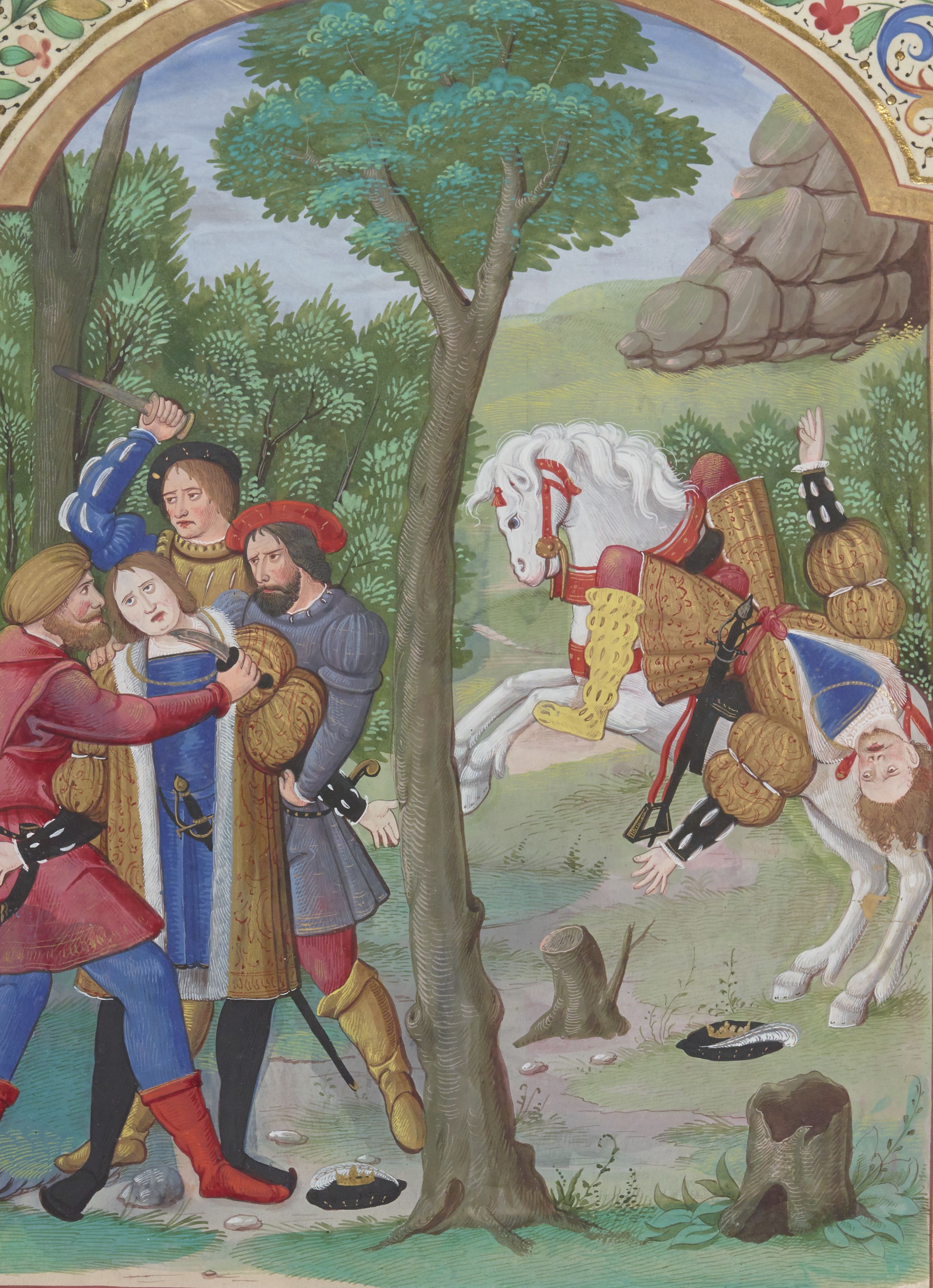Parigi, Bibliothèque Nationale de France, Fr. 130, f. 190v. Antioco viene ucciso nel bosco dai banditi; Seleuco cade da cavallo.