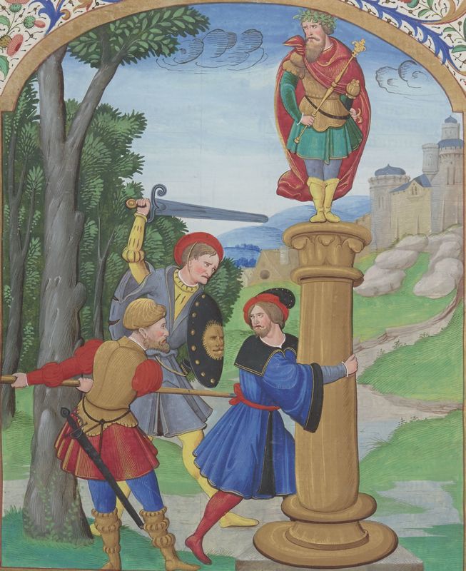 Parigi, Bibliothèque Nationale de France, Fr. 130, f. 278v. Marco Antonio Minore viene assassinato mentre tenta di ripararsi dietro una statua di Giulio Cesare.